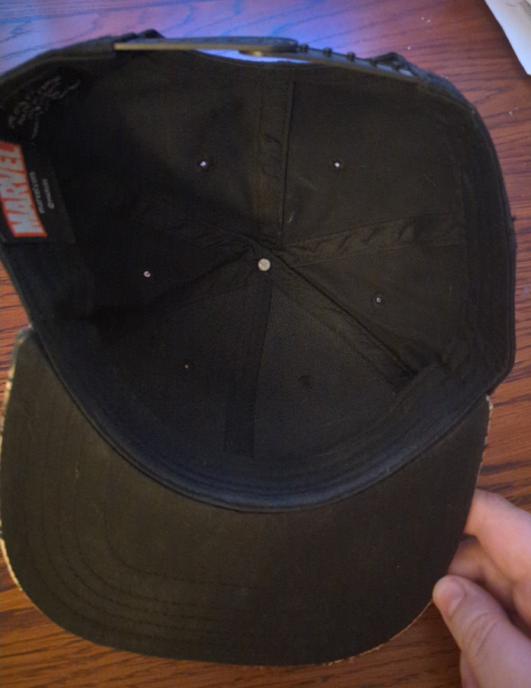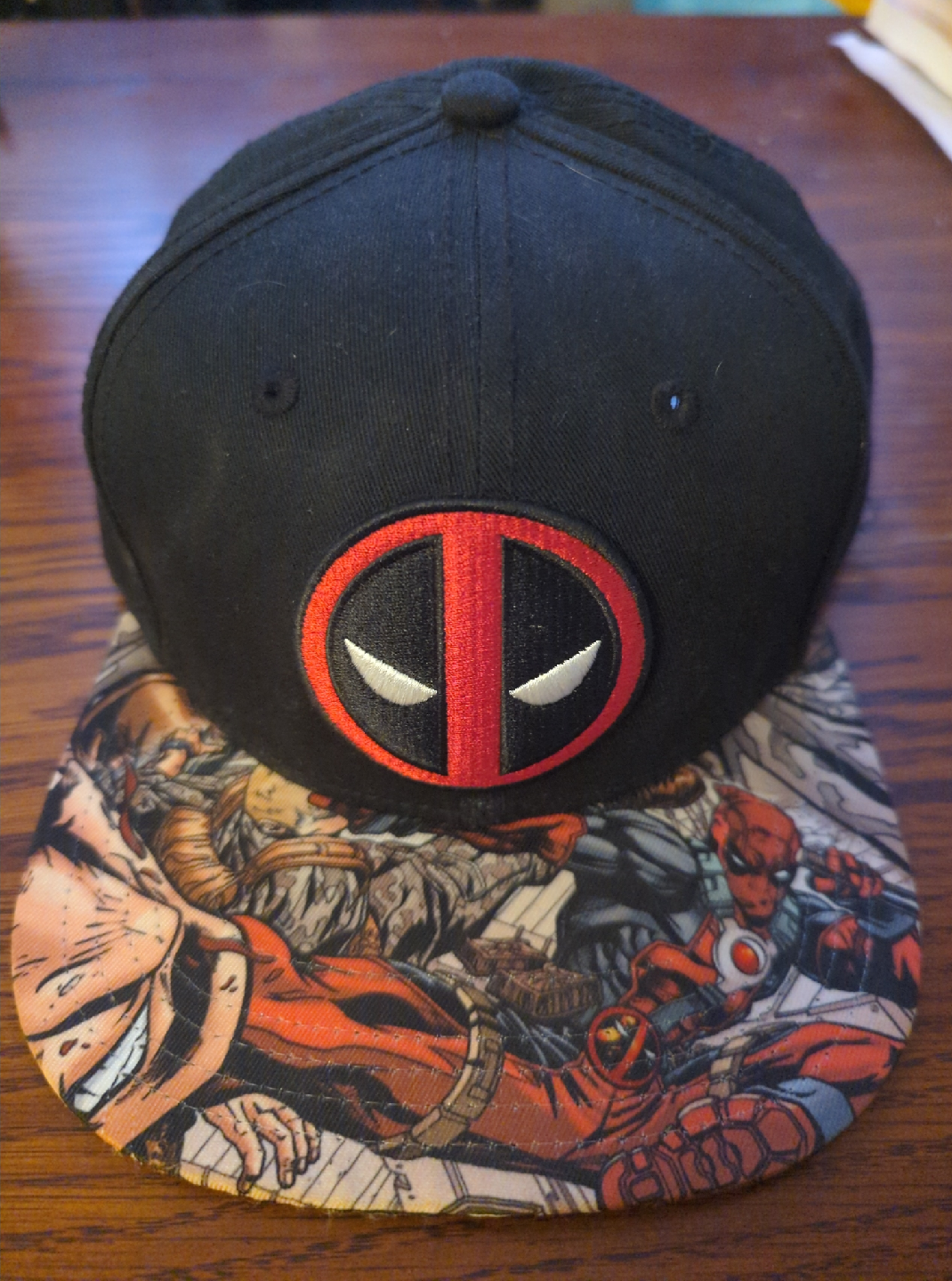 Selling a Deadpool hat from Marvel Comics. It's black with a unique comic book design on the brim and the Deadpool emblem embroidered on the front.