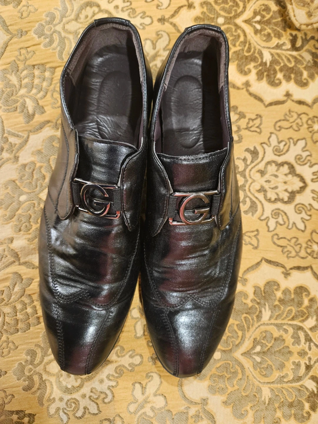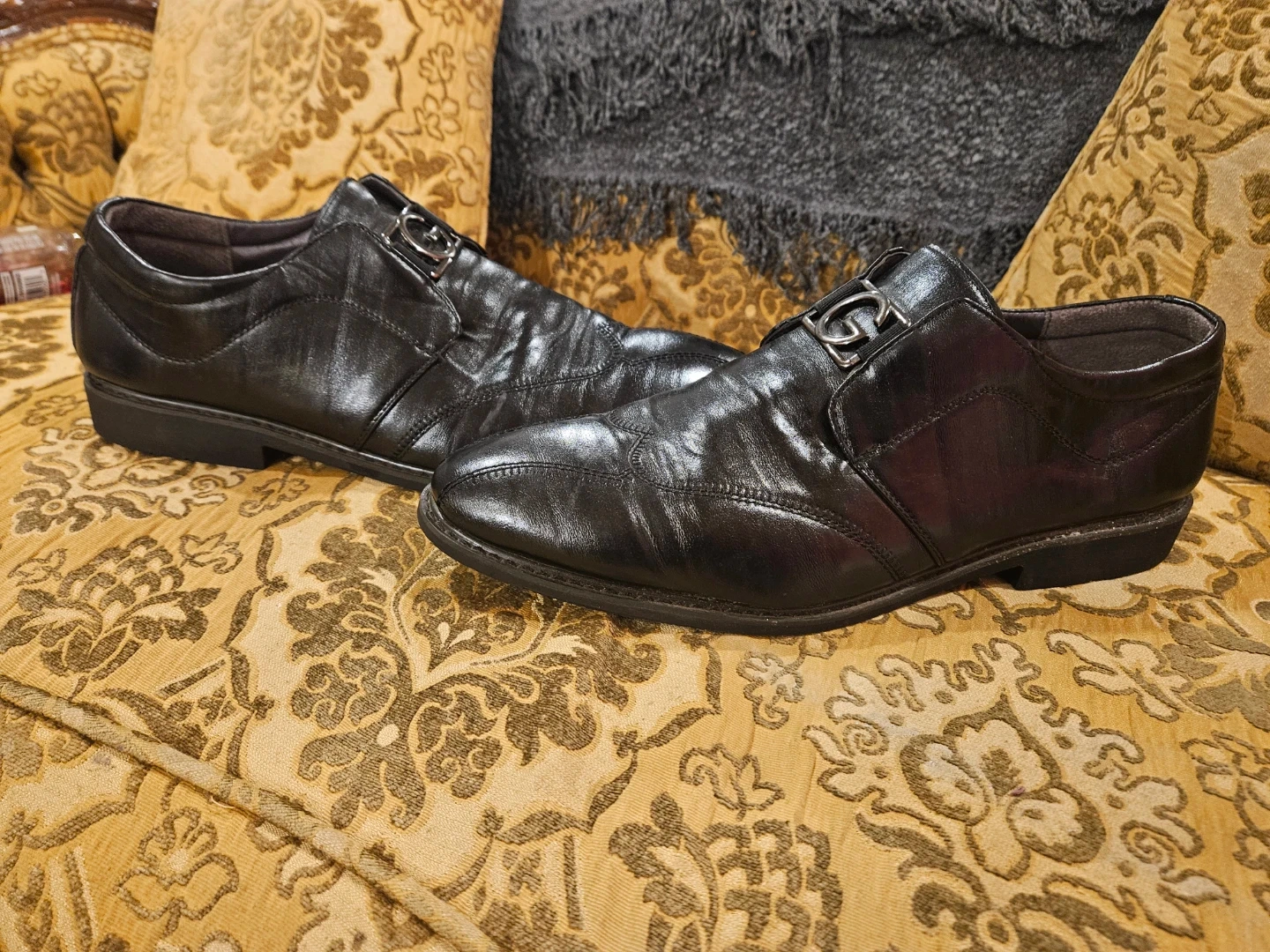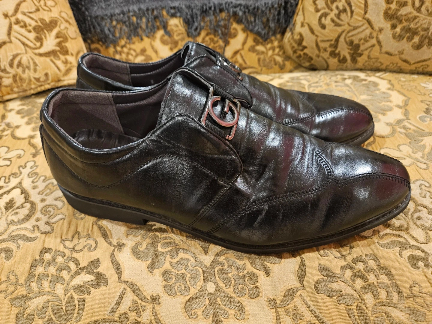 Black leather slip-on dress shoes with a decorative buckle accent. Features a cushioned insole and durable rubber sole. Size 43 EU. Size 13 or 14 US.