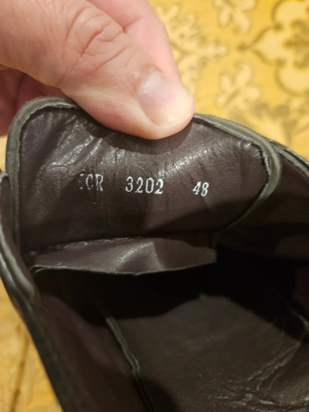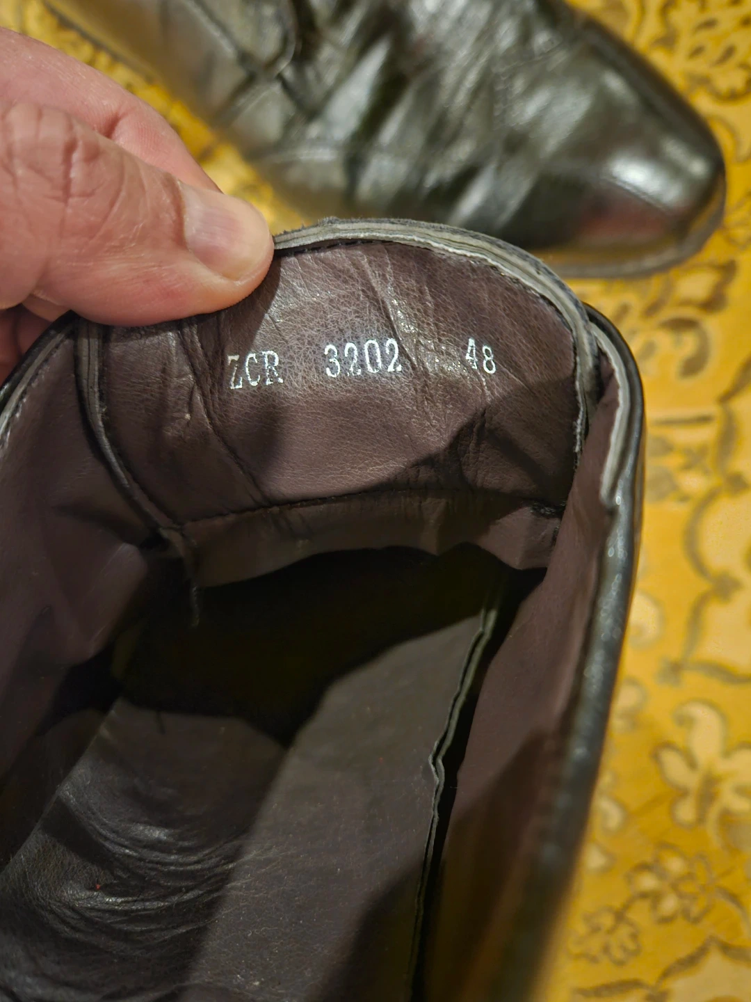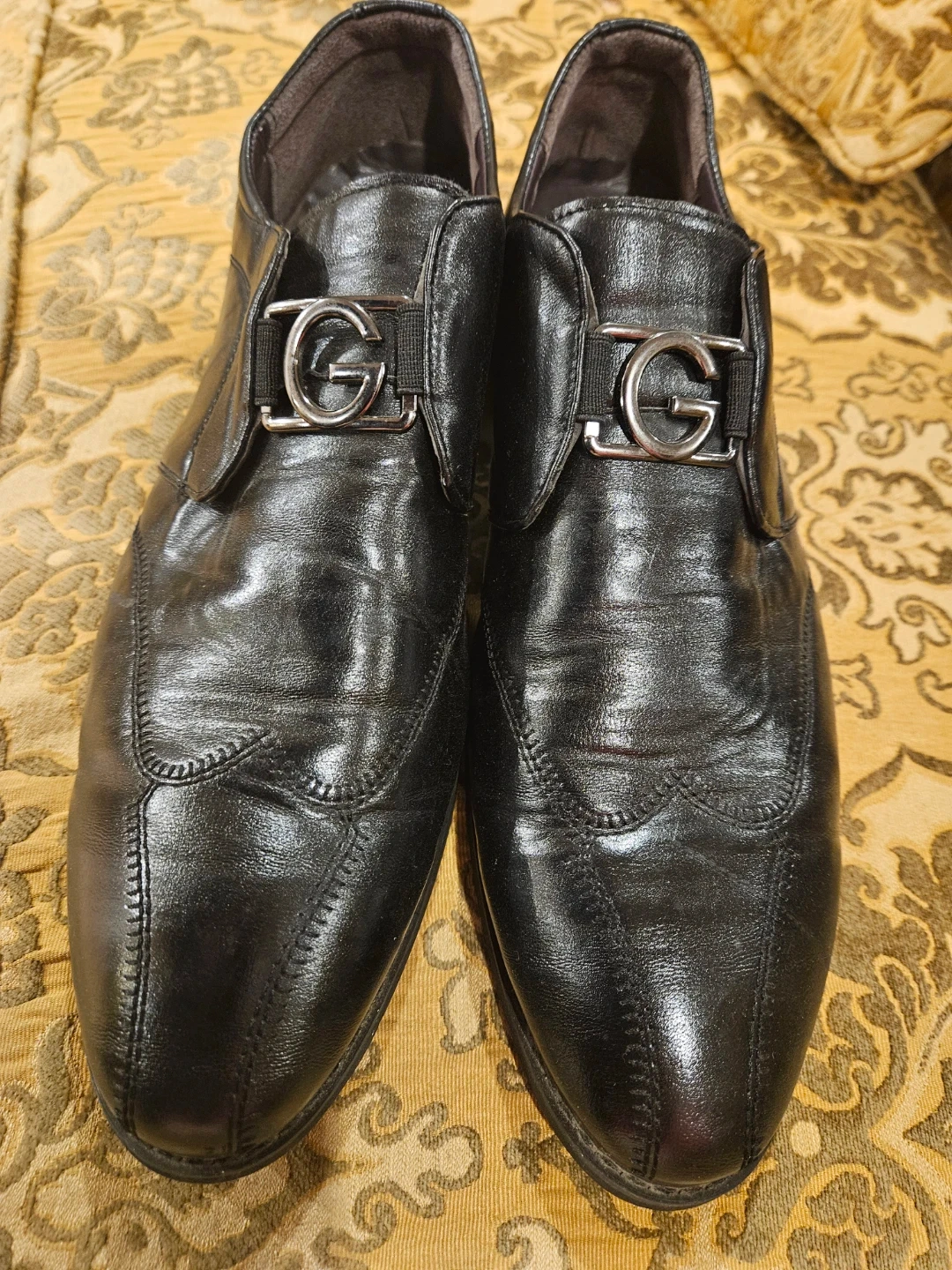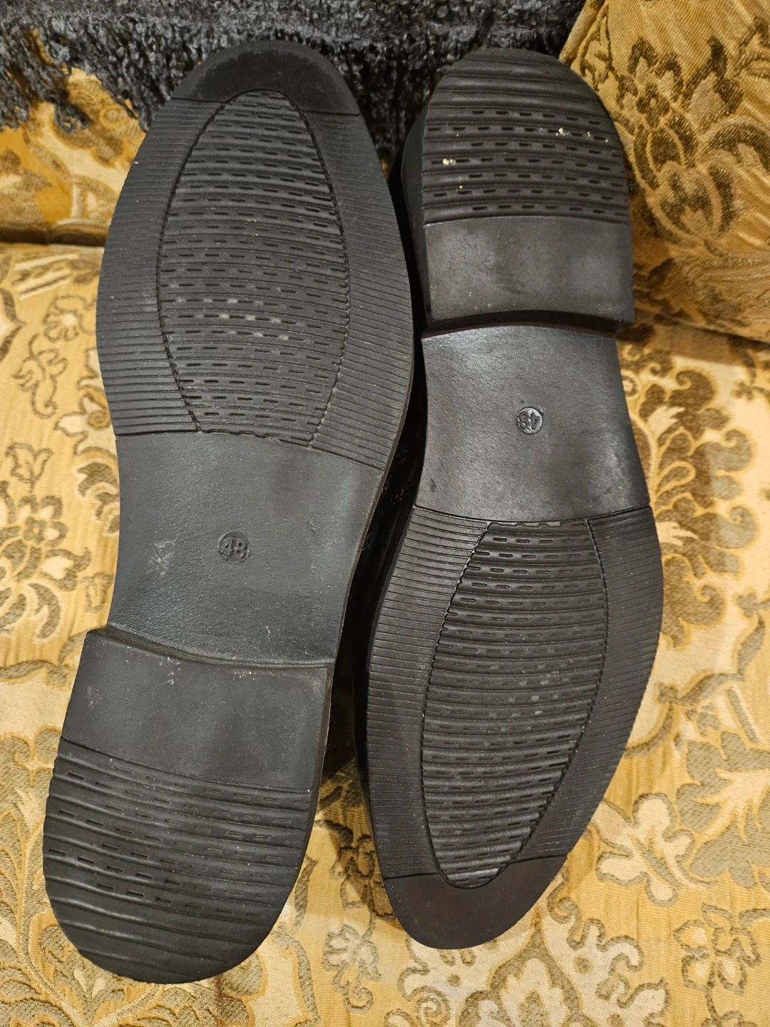 Black leather slip-on dress shoes with a decorative buckle accent. Features a cushioned insole and durable rubber sole. Size 43 EU. Size 13 or 14 US.