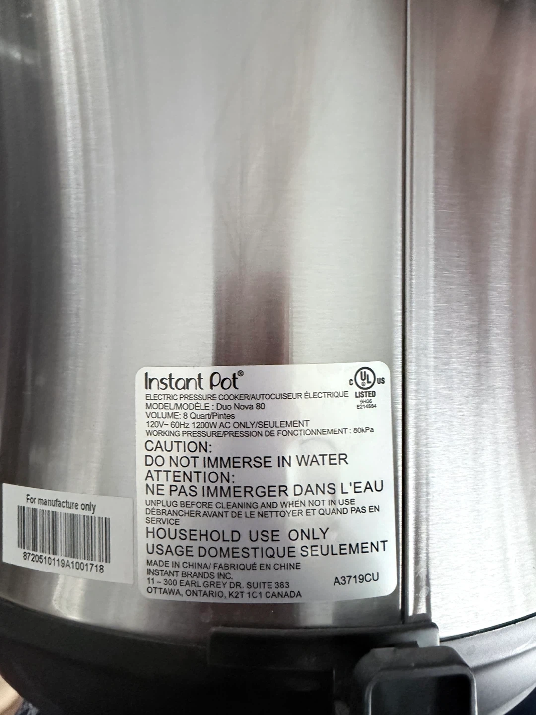 This is an Instant Pot Duo Nova 80 electric pressure cooker. It's a 120V-60Hz 1200W AC model. Features multiple cooking functions including soup, stew, meat, poultry, chili, rice, multigrain, porridge, steam, yogurt, sauté, slow cook, pressure cook, and keep warm. Local pick up only.