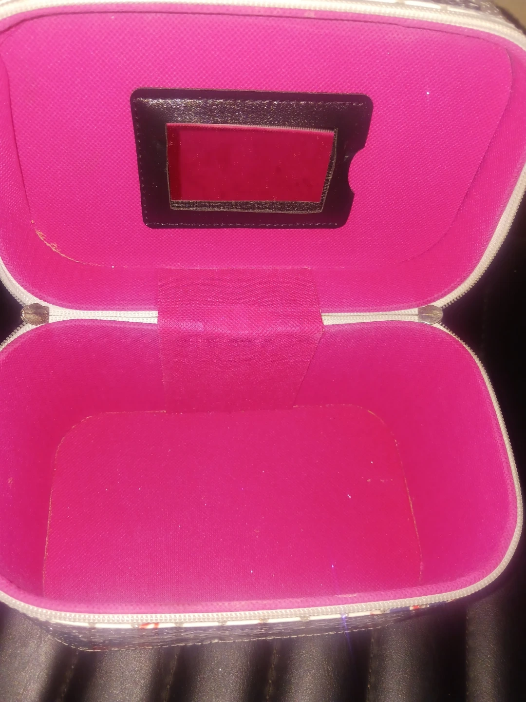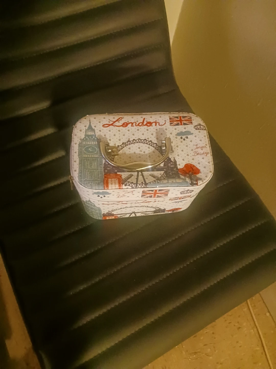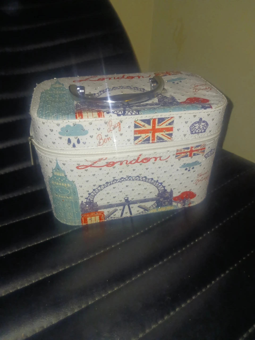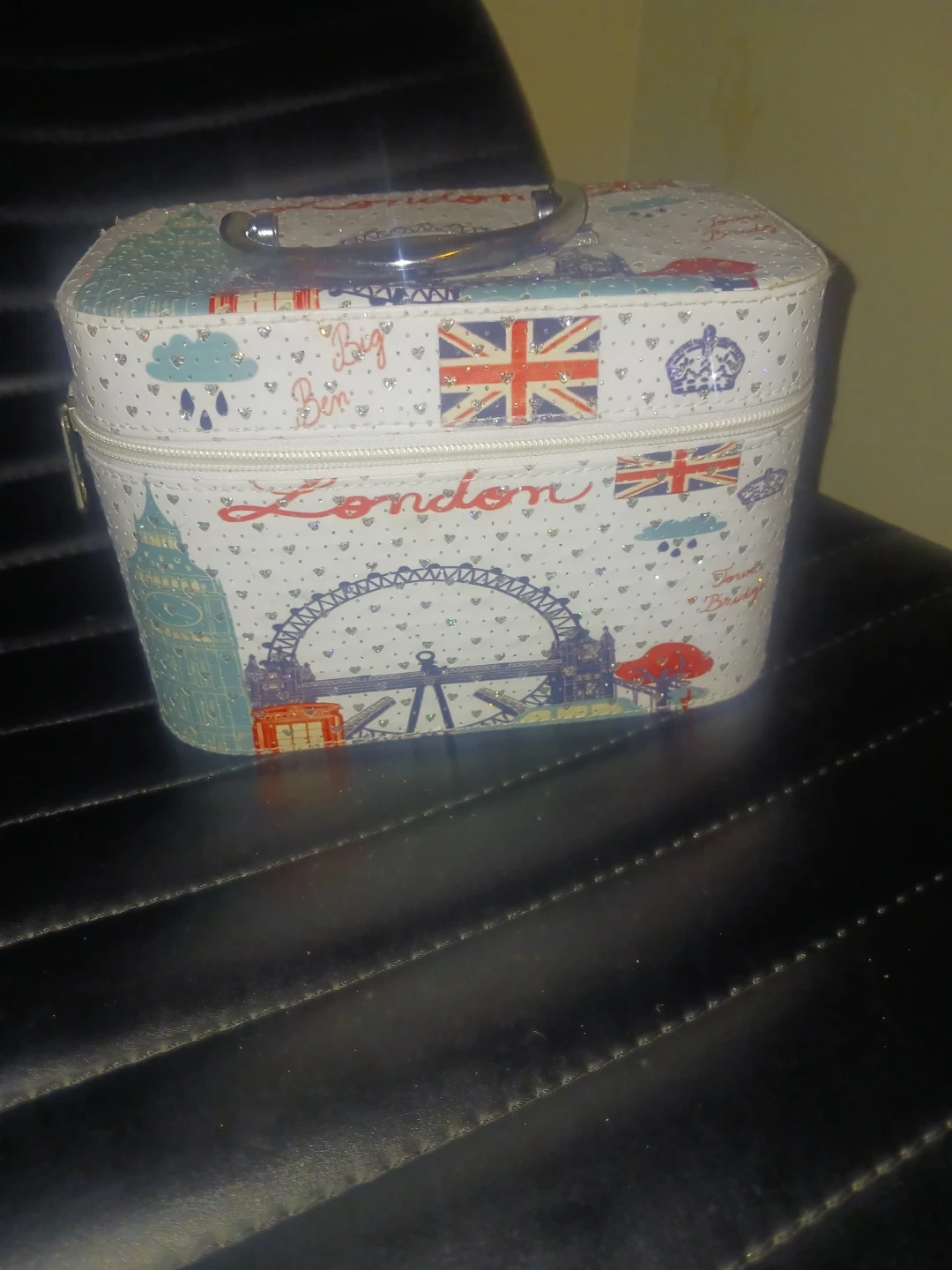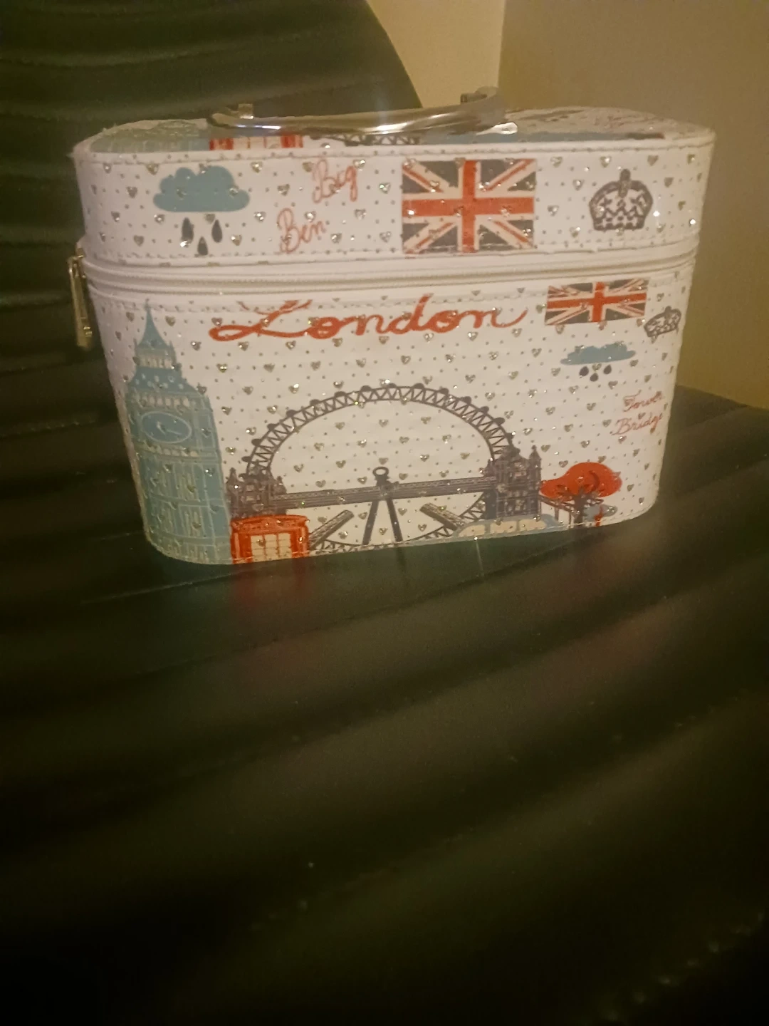 Never used This charming vanity case features a colorful London theme with iconic landmarks. It's perfect for storing makeup or travel essentials. Inside, you'll find a handy mirror. Great for anyone who loves London!