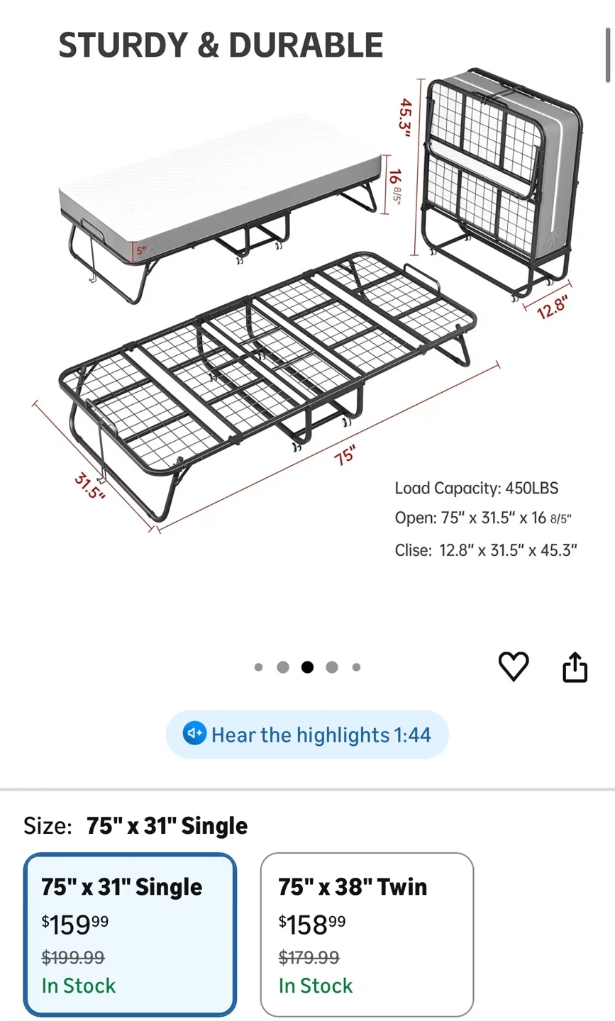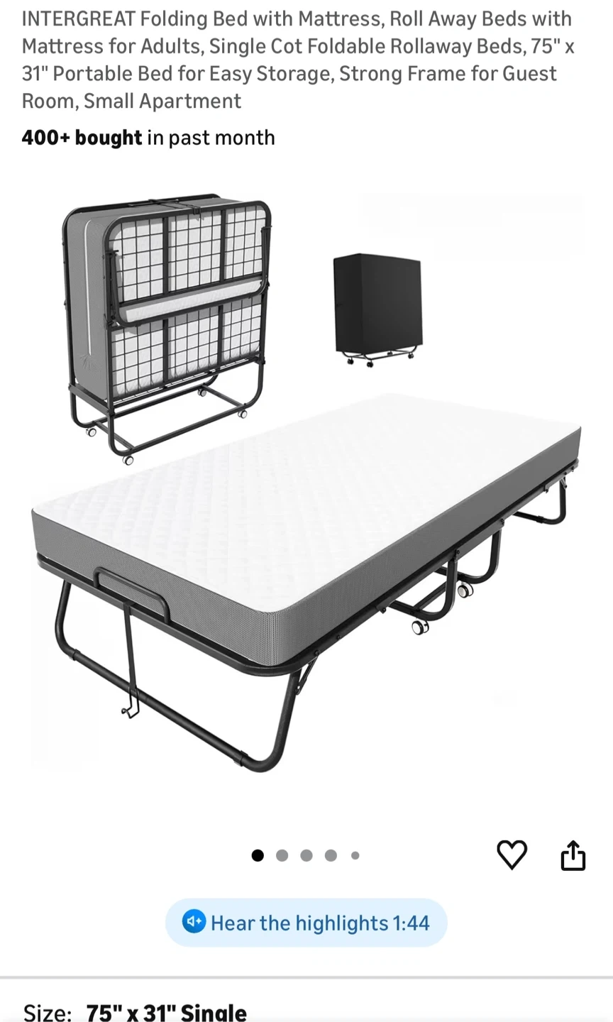 This folding bed comes with a mattress for adults. It's a single cot size, measuring 75" x 31" when open. The bed is in great condition, it was purchased on January 9, 2026 for a temporary living situation and is no longer needed. I will update the listing with pictures of the actual bed soon, it is currently in storage.