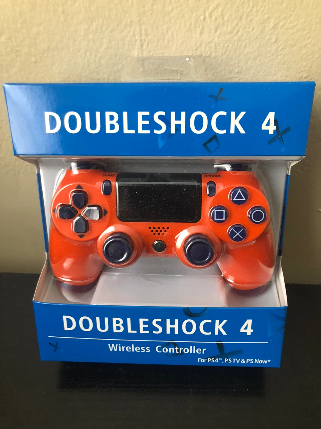 Orange Doubleshock 4 wireless controller. This controller is compatible with PS4, PS TV, and PS Now. It's a great addition for gaming!