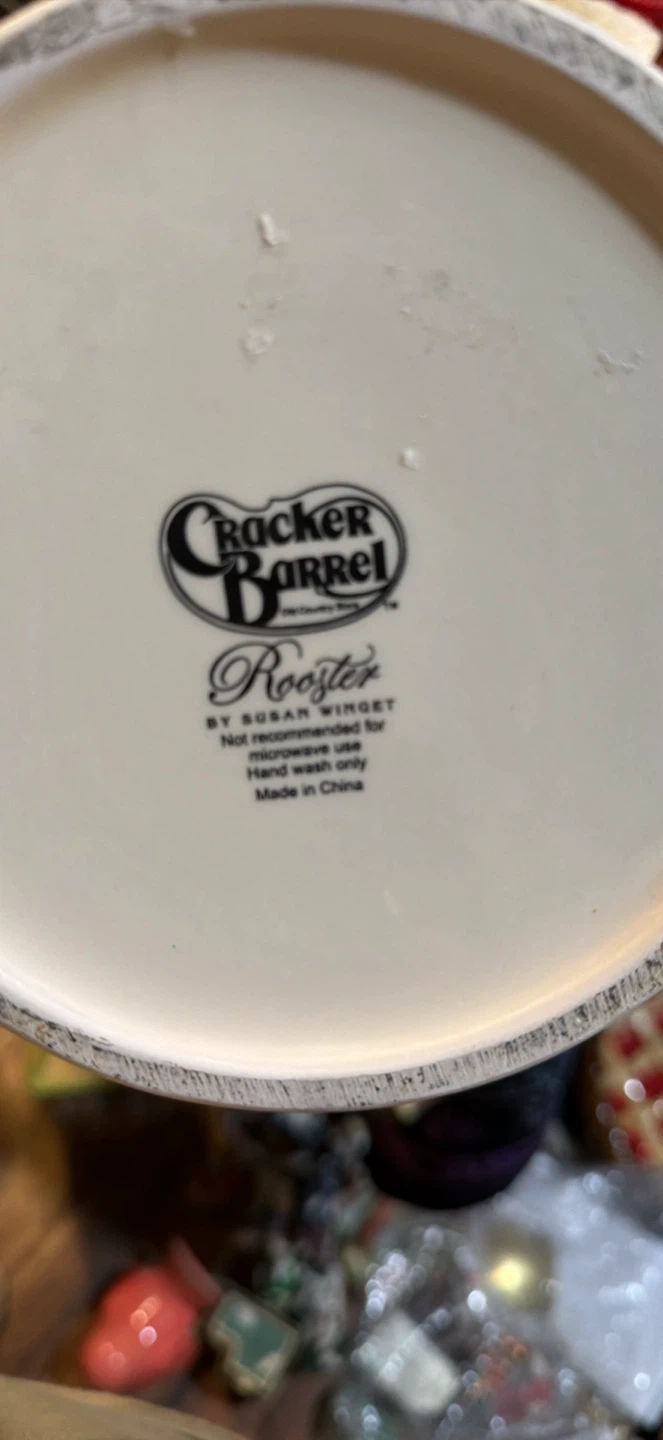 Ceramic cookie jar from Cracker Barrel, designed by Susan Winget. Features a rooster on the lid and a red accent. Hand wash only. Not recommended for microwave use.