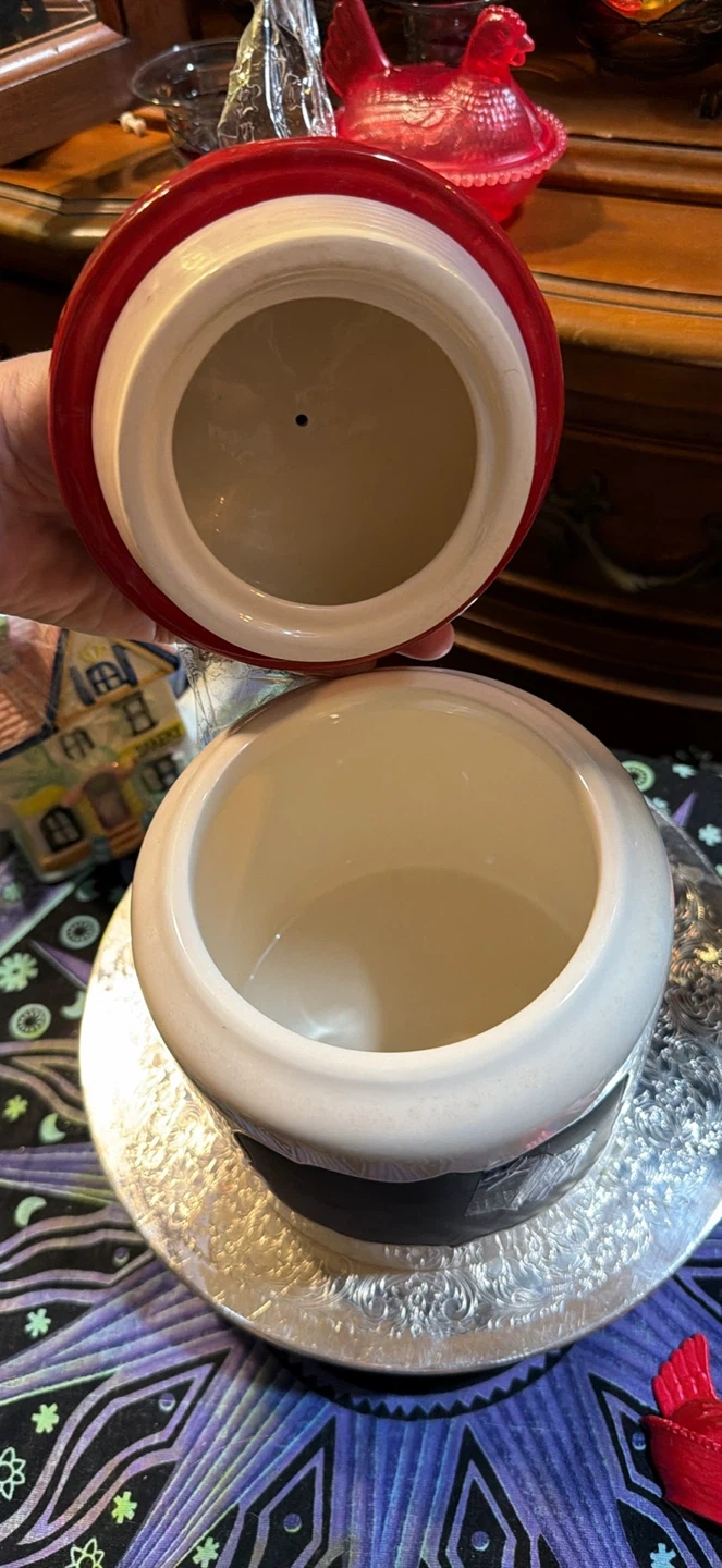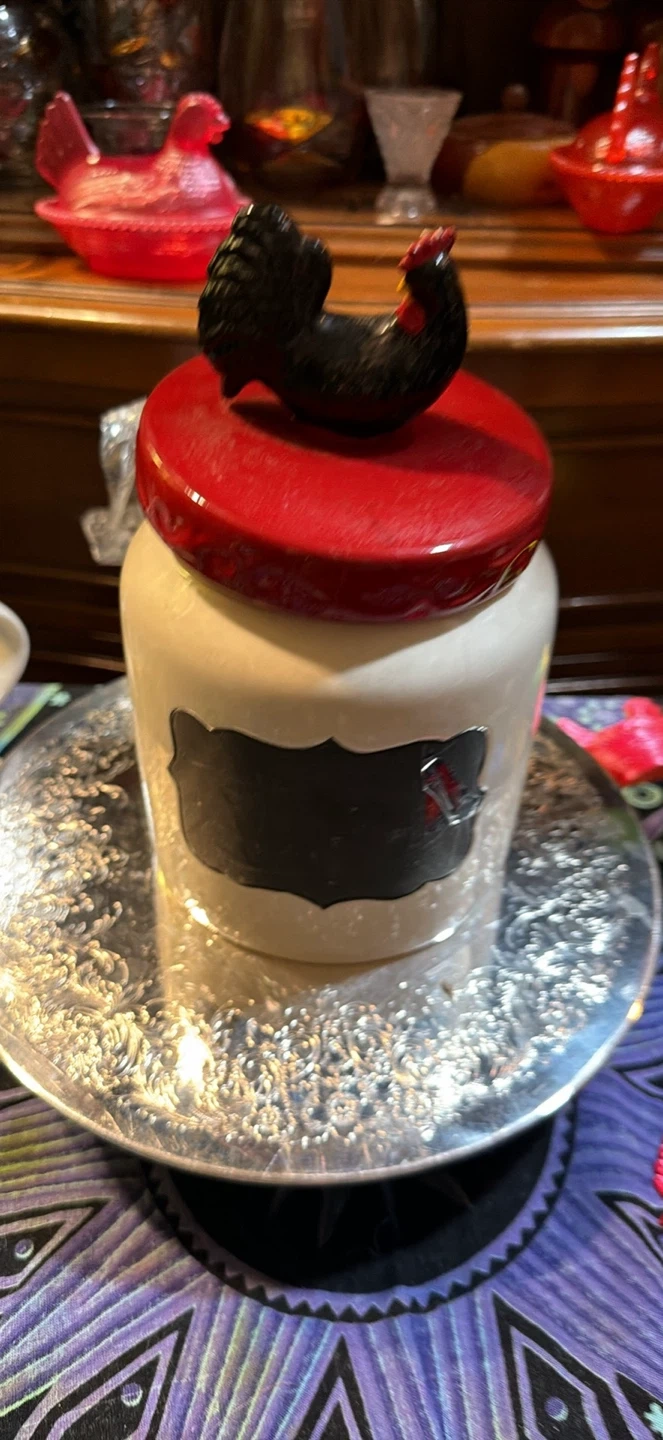 Ceramic cookie jar from Cracker Barrel, designed by Susan Winget. Features a rooster on the lid and a red accent. Hand wash only. Not recommended for microwave use.