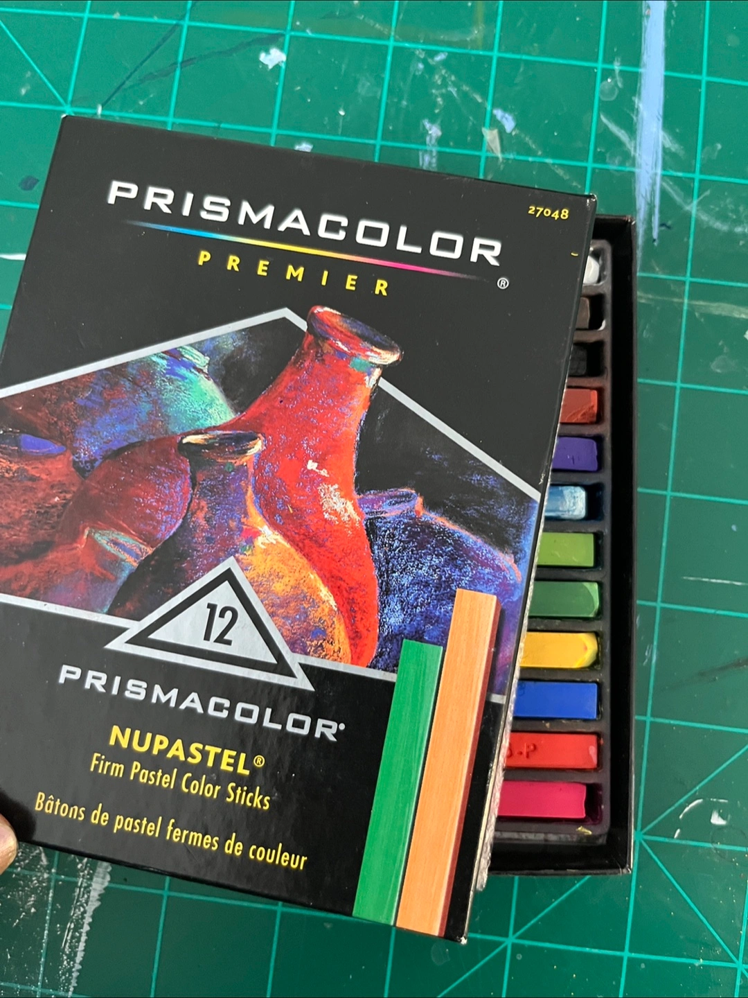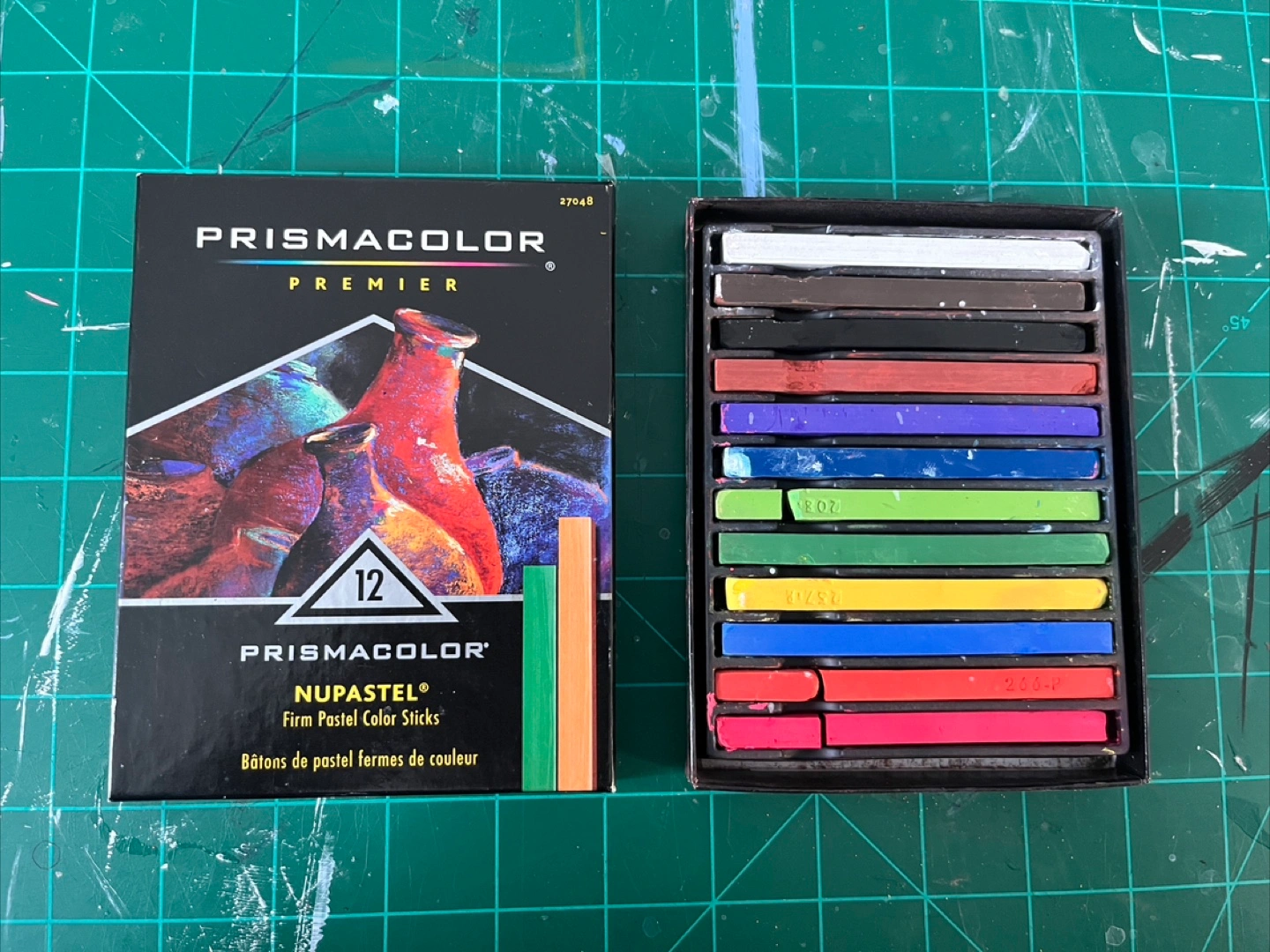 Box of Prismacolor NuPastel pastel color sticks. Features 12 color sticks. Used but good condition. All colors are present but a few sticks are broken (as is typical with pastels). These have been hanging out in my studio for a while — I gave them a try, but pastels just aren’t my thing, maybe for you they’ll be the perfect tool for relaxing after a long day.