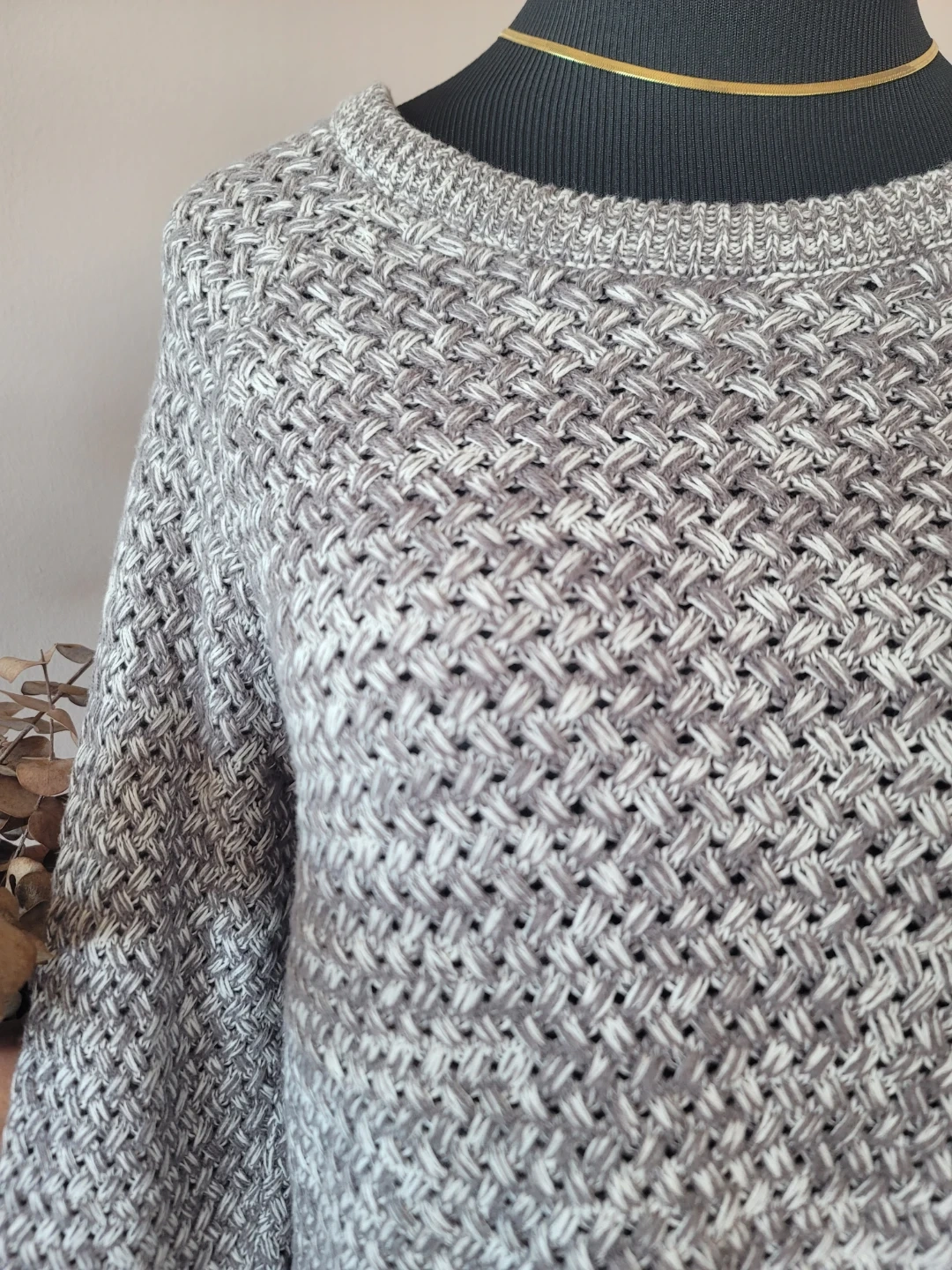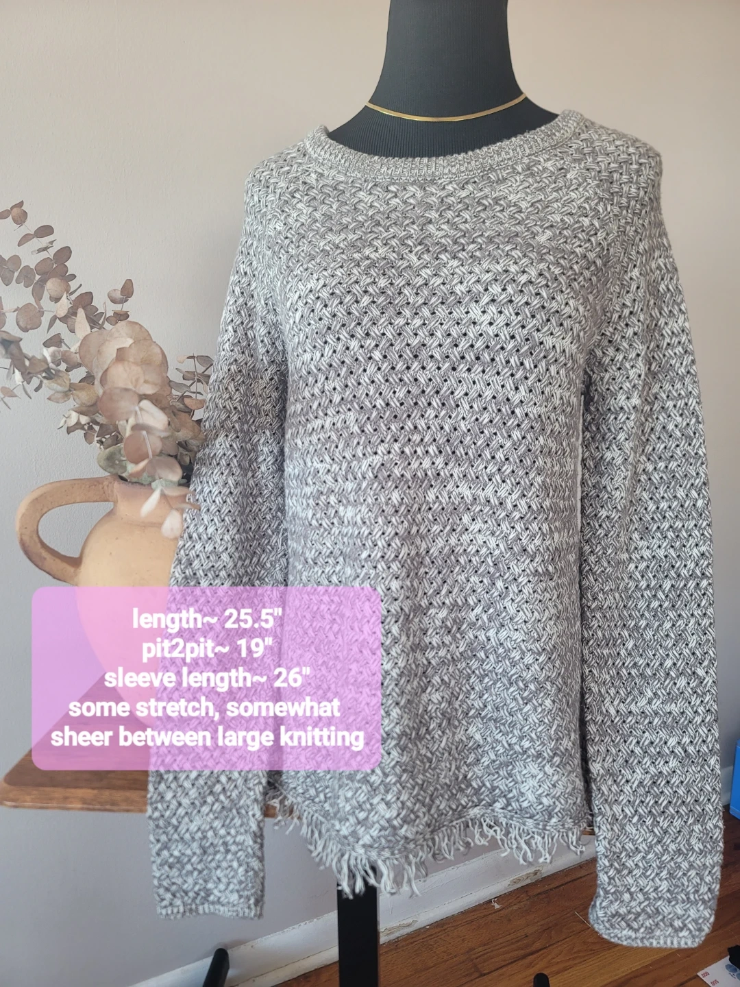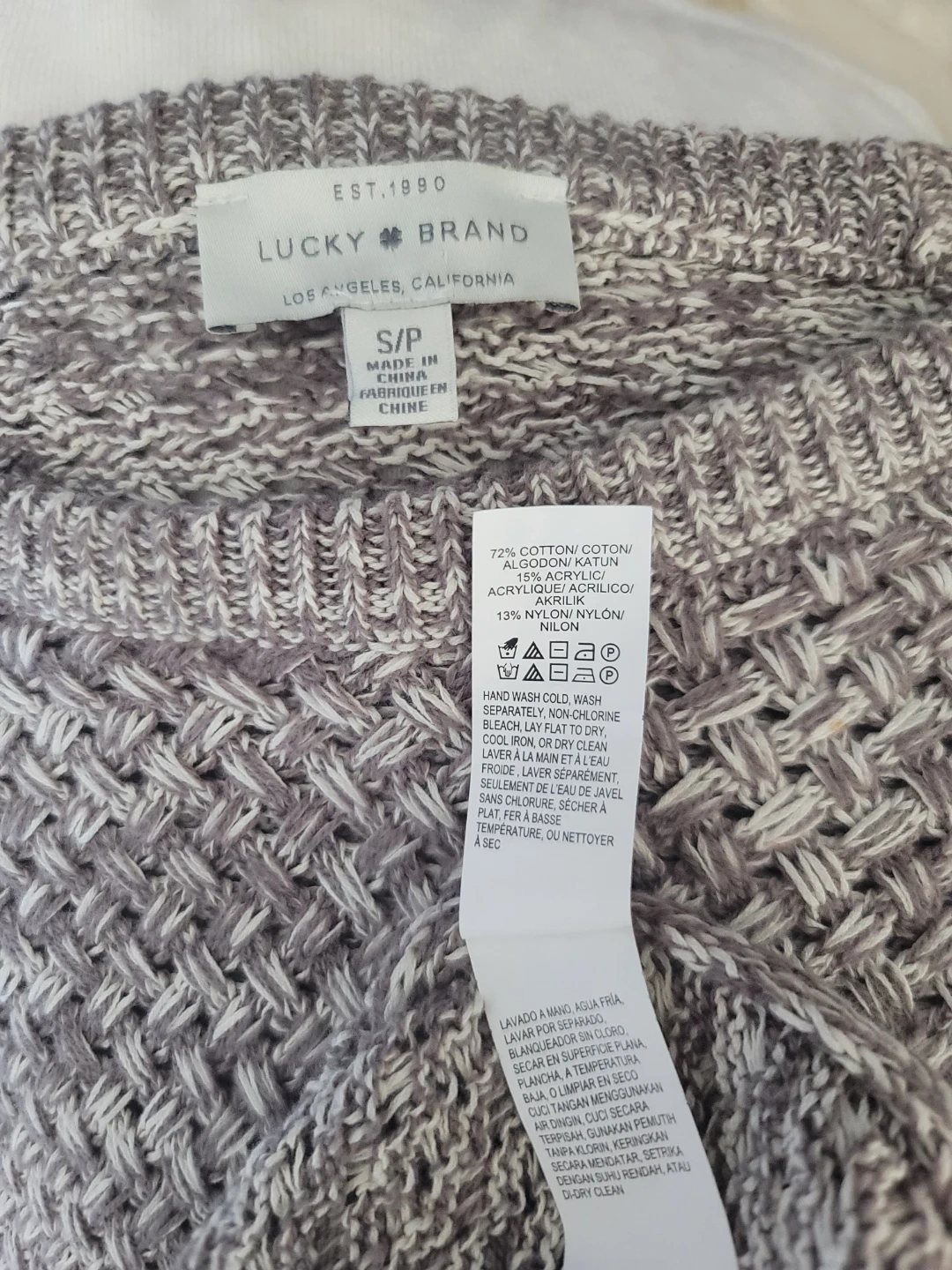 Cozy Lucky Brand knit sweater in a neutral gray and white pattern. It's a size S/P. The material is a blend of 72% cotton, 15% acrylic, and 13% nylon. It has a length of about 25.5 inches, pit to pit around 19 inches, and sleeve length of 26 inches. It's somewhat sheer due to the large knitting, and has some stretch to it