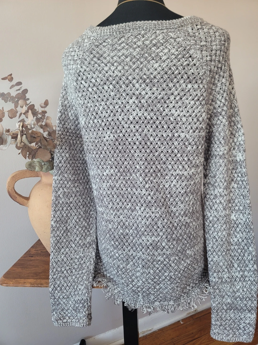 This stylish Lucky Brand pullover is perfect for a boho, Cottagecore or casual, minimal, or business casual look. The unique gray and white basket weave knit pattern adds a great texture, and the fringe trim along the hem and sides provides a fun, trendy detail giving it a grunge or western style while remaining minimalist. It's a cozy and comfortable piece that can be layered worn for various occasions including being versatile option for casual outings, spring layering, all day comfort, work or the office and more.