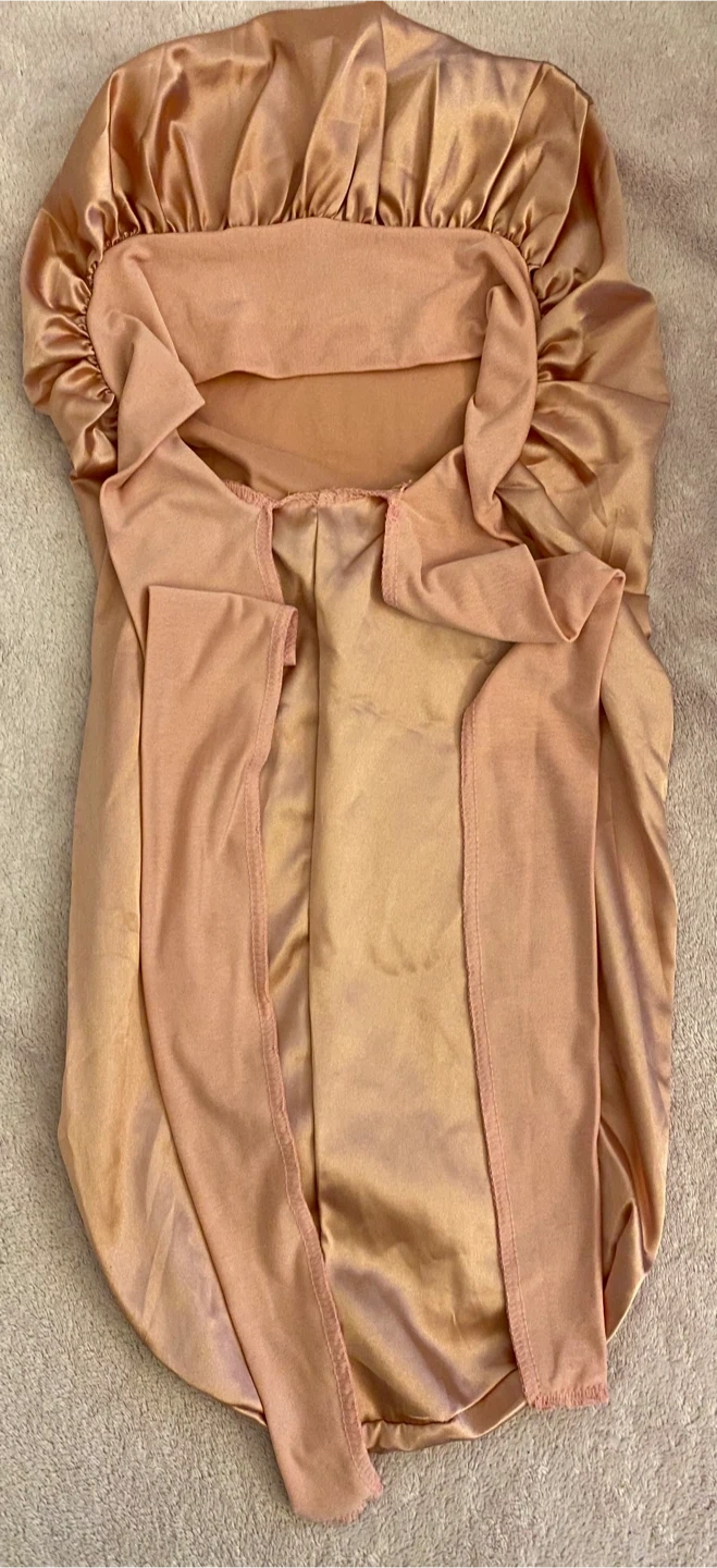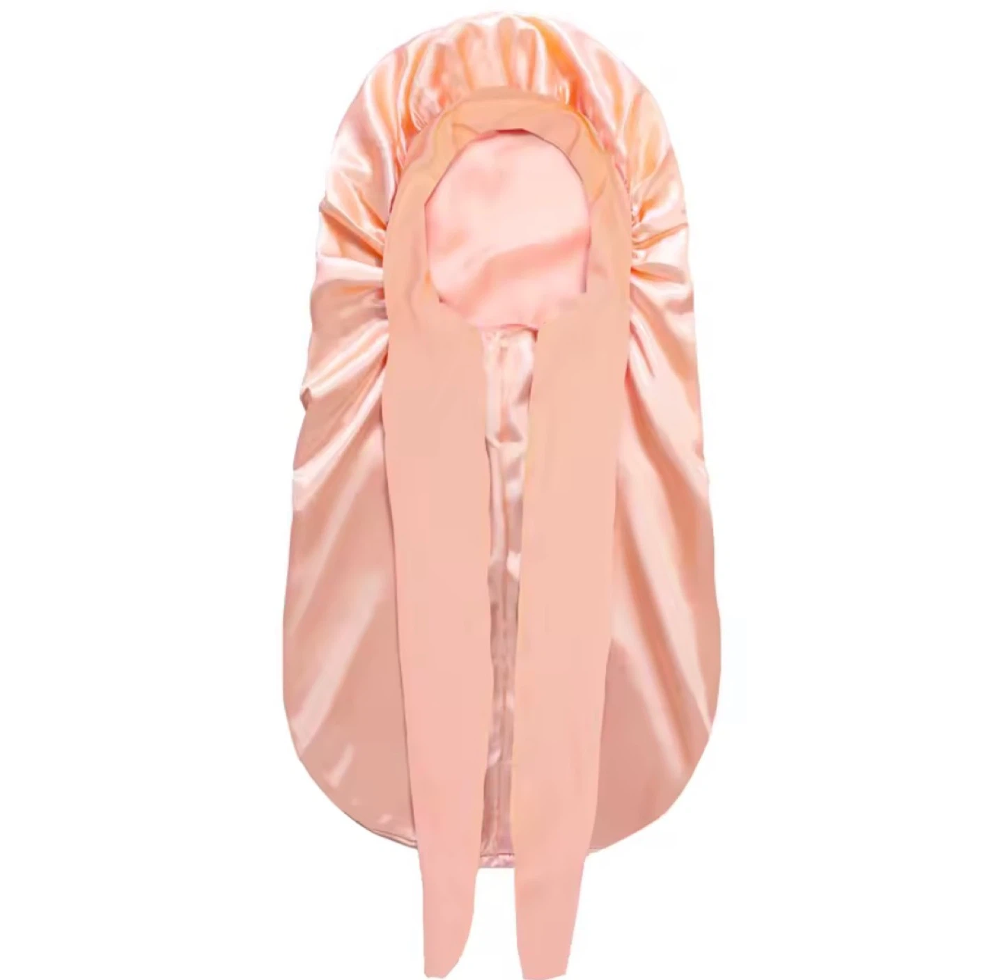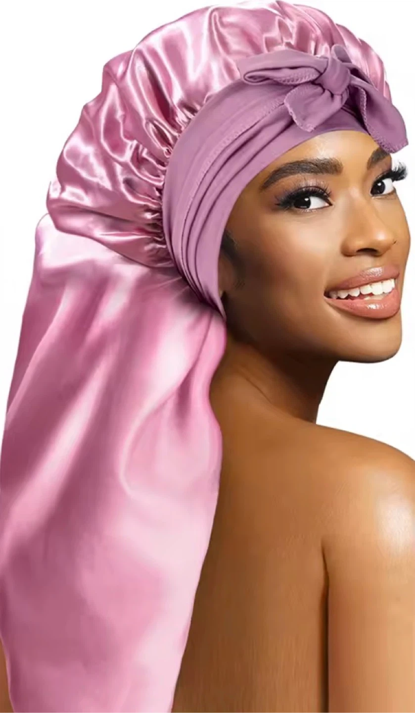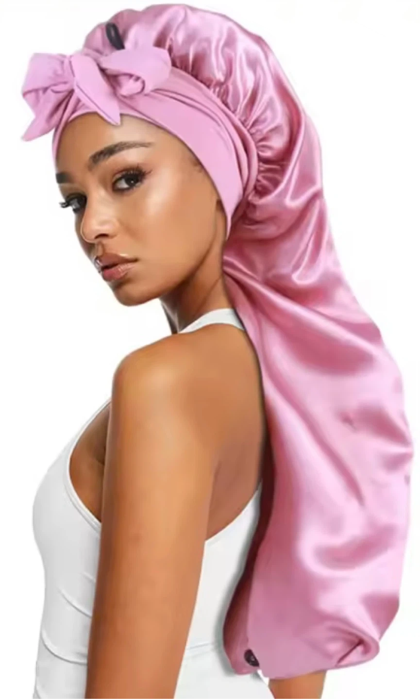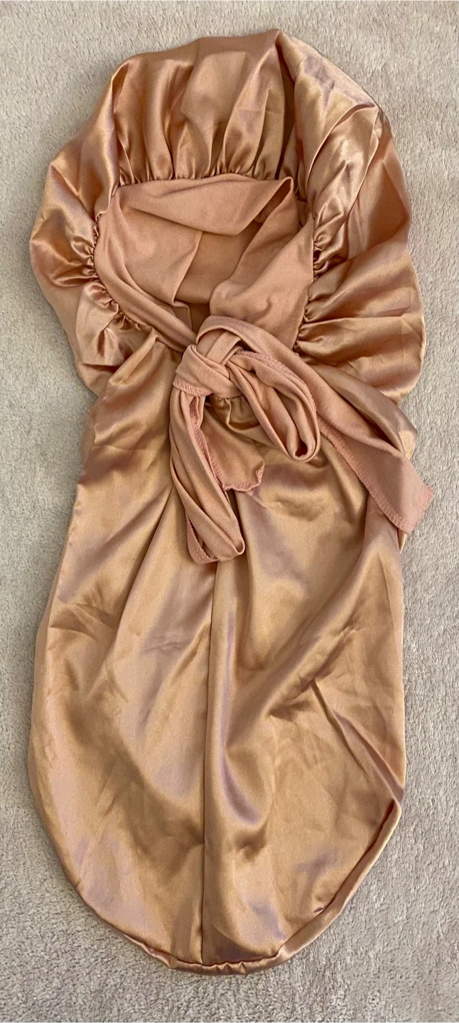 This satin bonnet hair wrap is designed to protect your hair overnight. Its silky material helps reduce frizz and breakage. Features long adjustable ties for a secure fit.