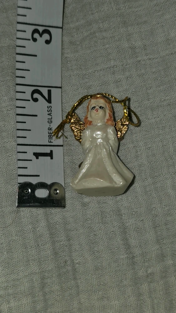 This is a small angel figurine ornament, approximately 2 inches tall. It has a gold string for hanging and would make a nice addition to any holiday decor