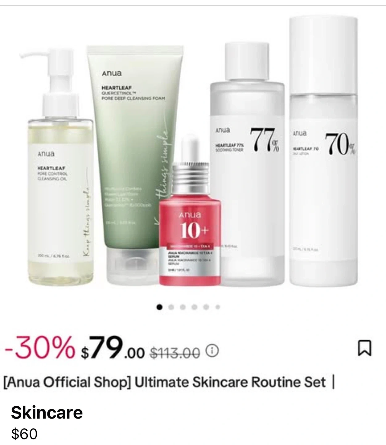 Anua Heartleaf Skincare Routine Set includes cleansing oil, pore deep cleansing foam, 10+ serum, 77% soothing toner, and 70% ampoule. These products are designed to care for your skin.