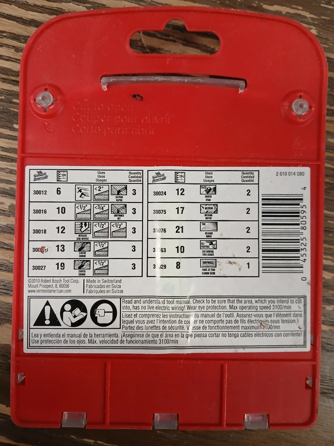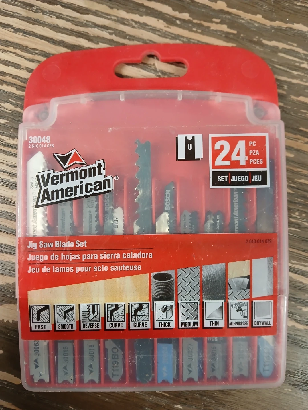 This is a 24-piece jig saw blade set from Vermont American. It includes a variety of blades for different cutting tasks, such as fast, smooth, reverse, curve, thick, medium, thin, all-purpose, and drywall cutting. Blades are made in Switzerland.