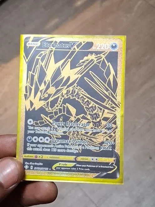 This is a Pokemon Eternatus V card. It has 220 HP and features the 'Power Accelerator' and 'Dynamax Cannon' attacks. The card is gold and black.