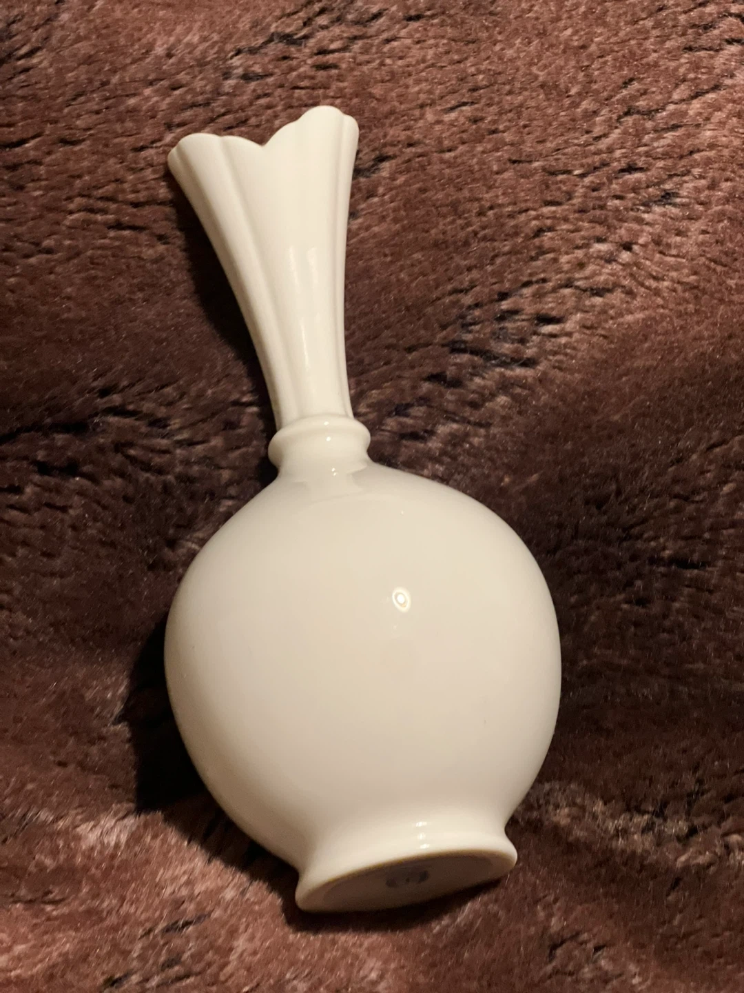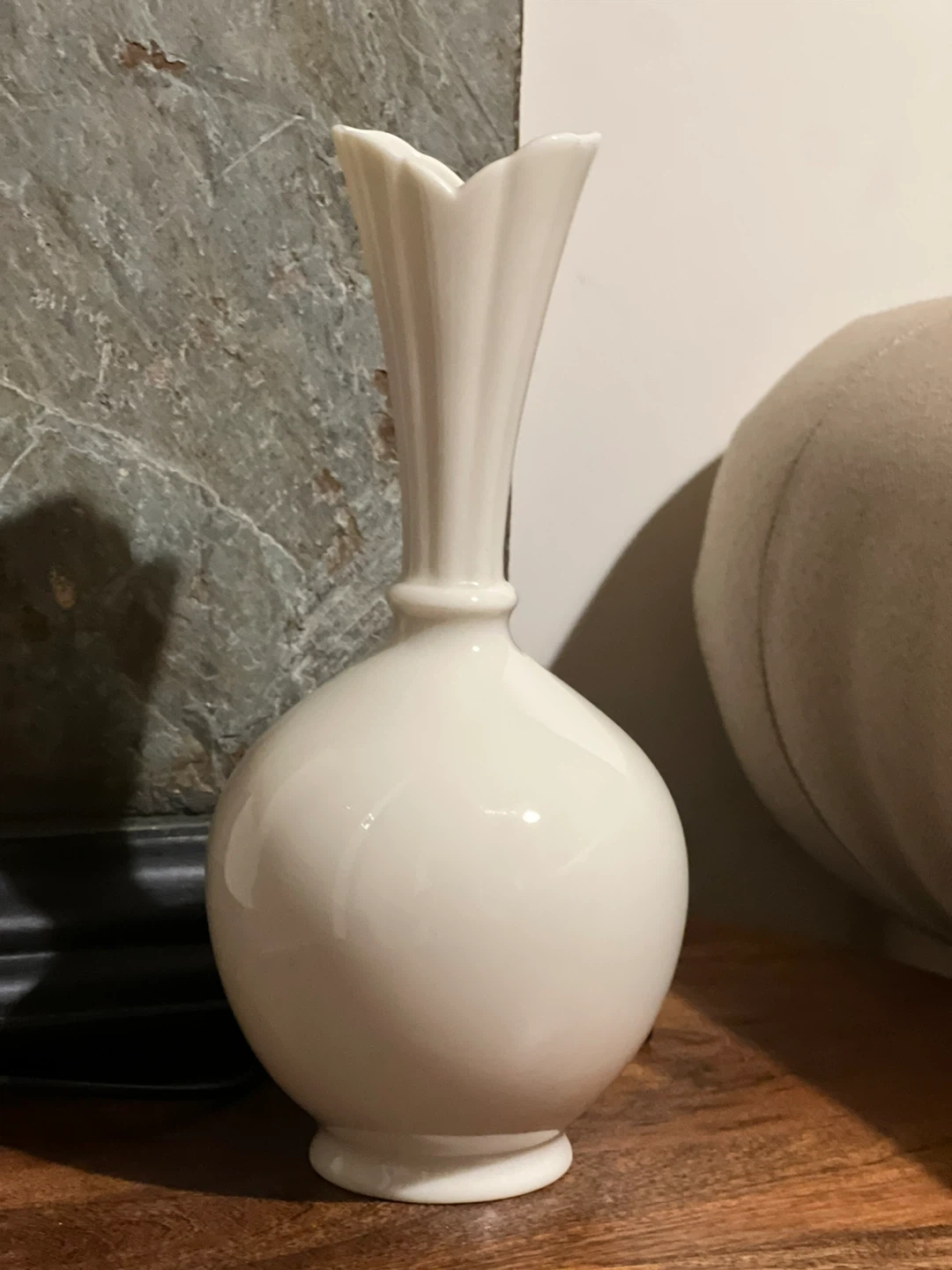 This is a vintage Lenox bulbous bud vase in a classic ivory cream porcelain finish. Design: It features a minimalist, sculptural design with an onion-shaped round base and a tall, slender neck that flares into a fluted, petal-like rim. Dimensions: This specific model stands approximately 8 inches tall. Material: Crafted from signature fine Lenox porcelain, known for its creamy, monochromatic ivory tone. Markings: Features the Lenox hallmark stamp on the bottom, identifying it as being made in the USA. Style: The vase is often described as having an Art Deco or Mid-Century Modern aesthetic, making it a versatile decorative accent. Pre owned Pickup is 58th and 7th Ave