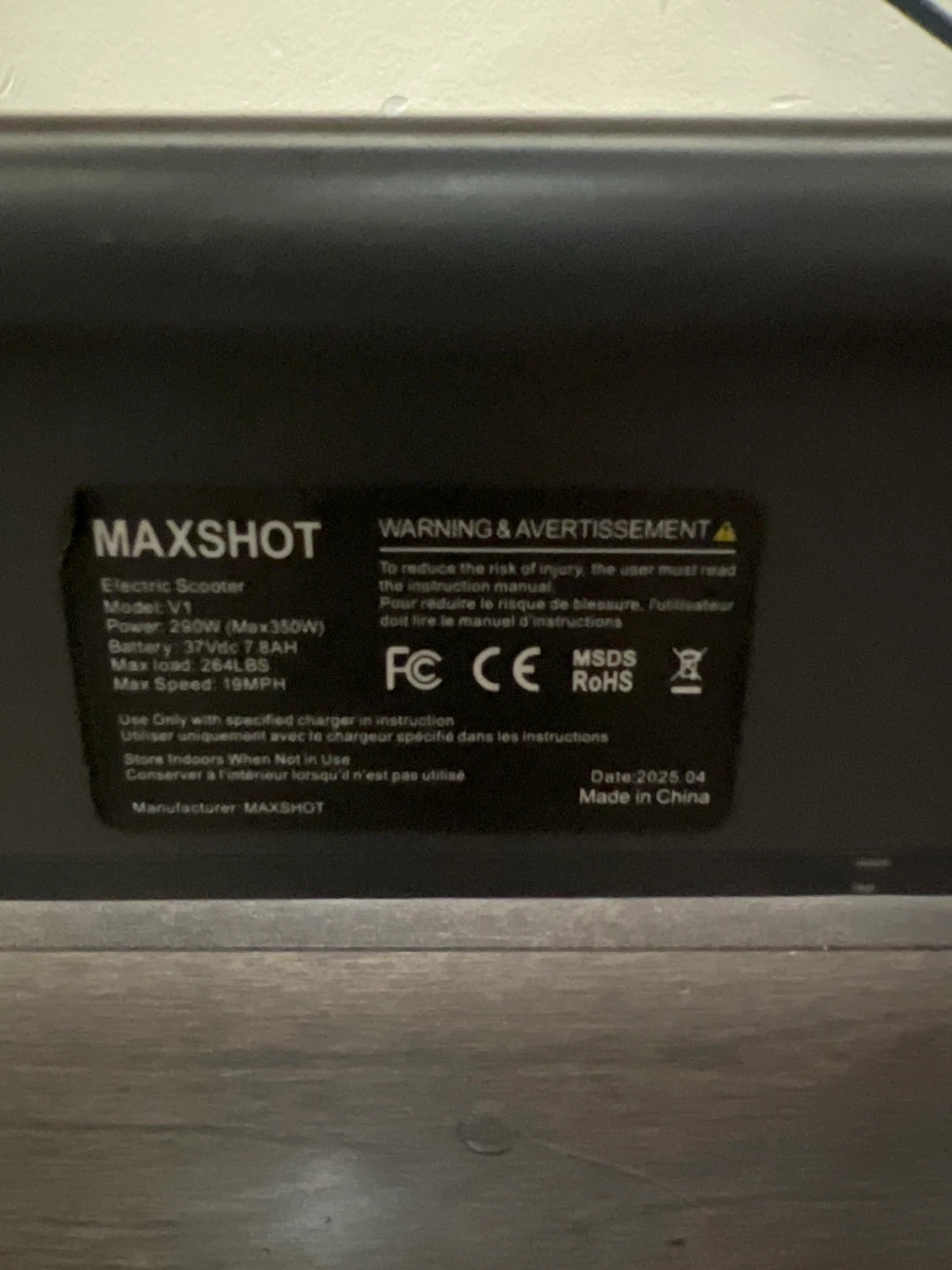 Selling a MAXSHOT V1 Electric Scooter! It has a headlight, speed display, and cruise control. The scooter is powered by 290W (Max350W) and a 37Vdc 7.8AH battery. Maximum load is 264LBS and max speed is 19MPH. The scooter has a dual braking system and lighting system.