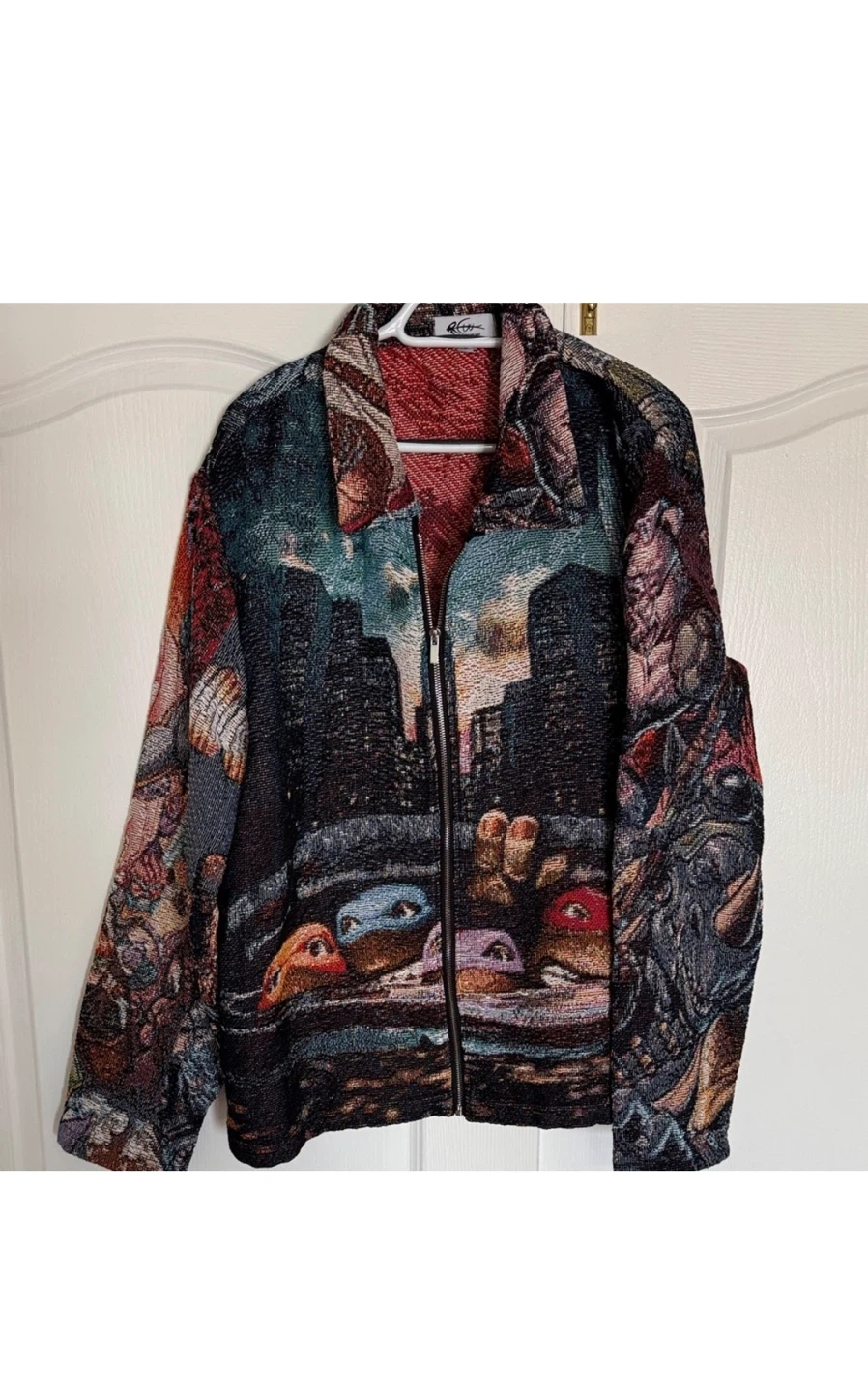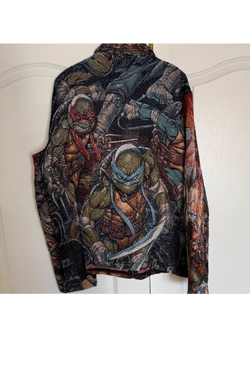 Cool tapestry jacket featuring the Teenage Mutant Ninja Turtles! It's a statement piece with a full zip-up front. Great for any TMNT fan looking to show off their style.