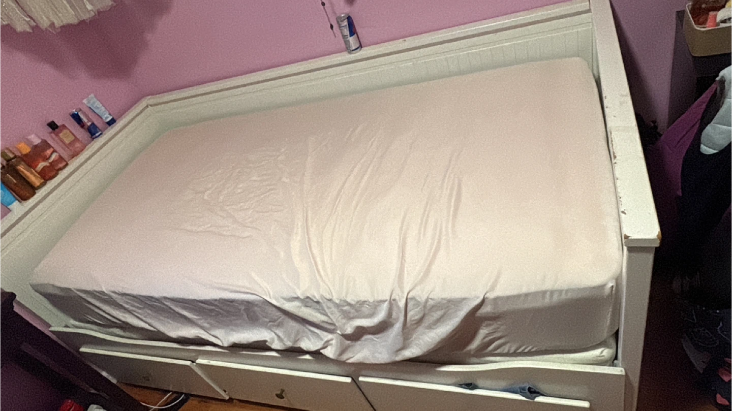 Selling a bed frame in white! It has storage drawers underneath for extra space. There are signs of wear and tear.