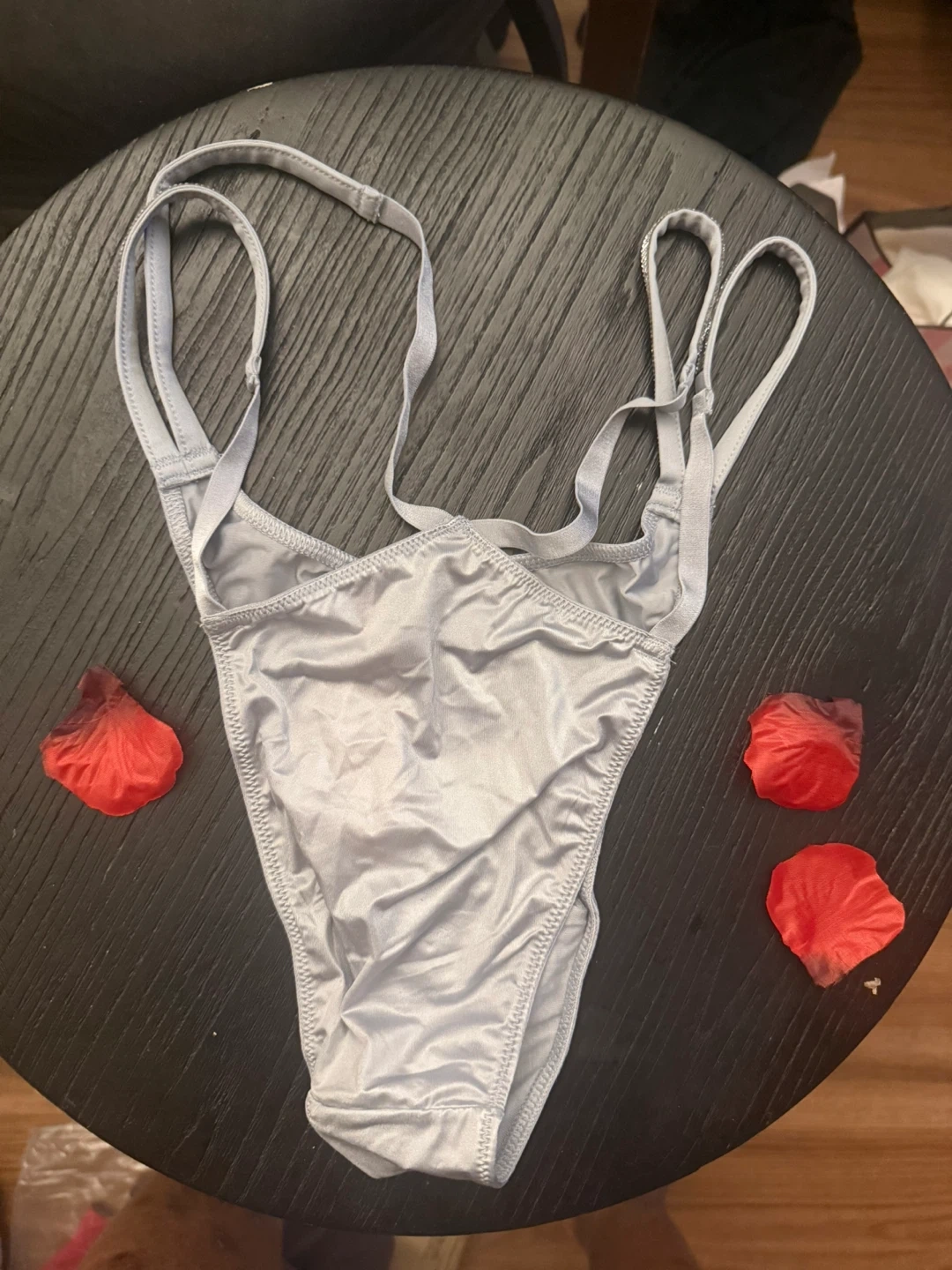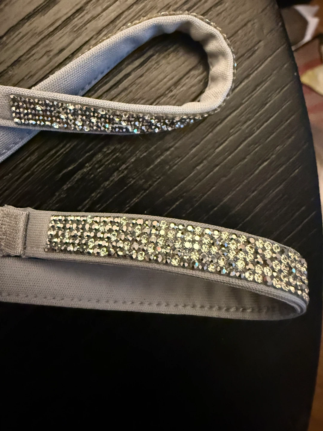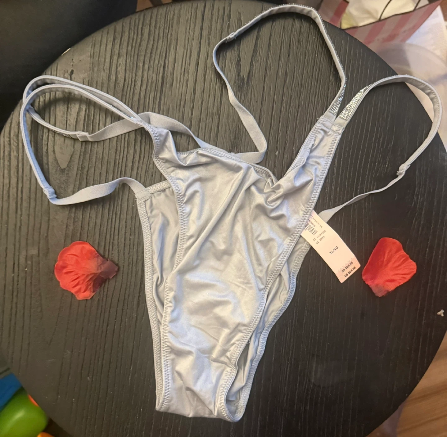 This Victoria's Secret G-string panty is silver with rhinestone detailing on the straps. It's a strappy design for a flattering fit. Size XL.
