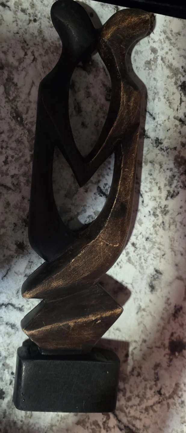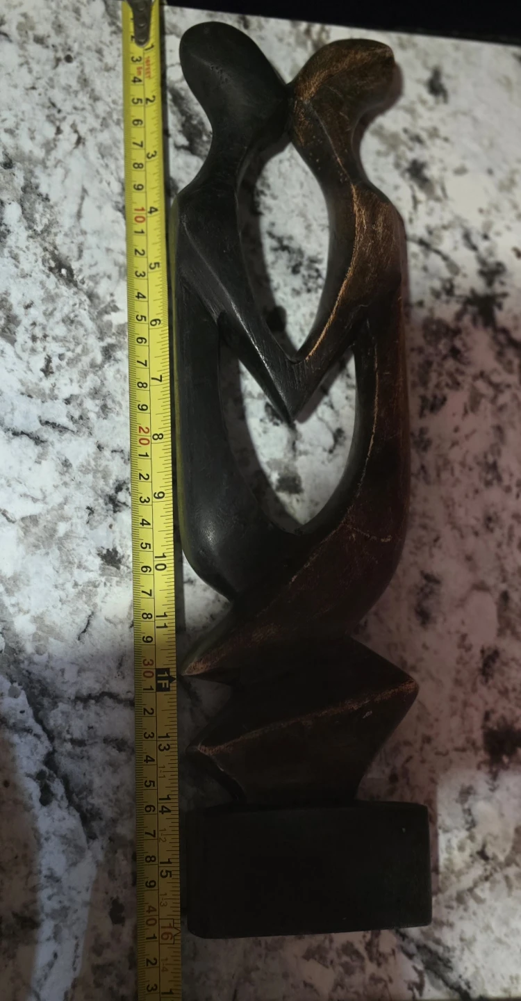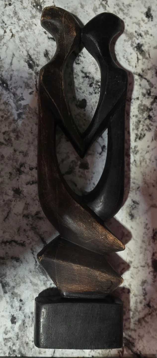 This abstract wooden sculpture depicts a loving couple intertwined. It's made of dark wood with a slightly distressed finish on the edges. The base is solid black wood. Approximately 13 inches tall.