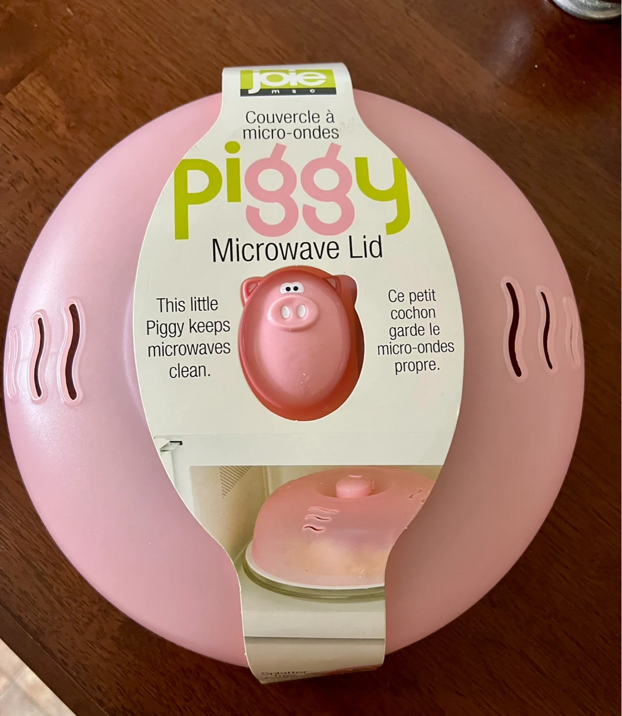 This item is a Joie Piggy Microwave Lid, a splatter guard designed to prevent messes in the microwave.