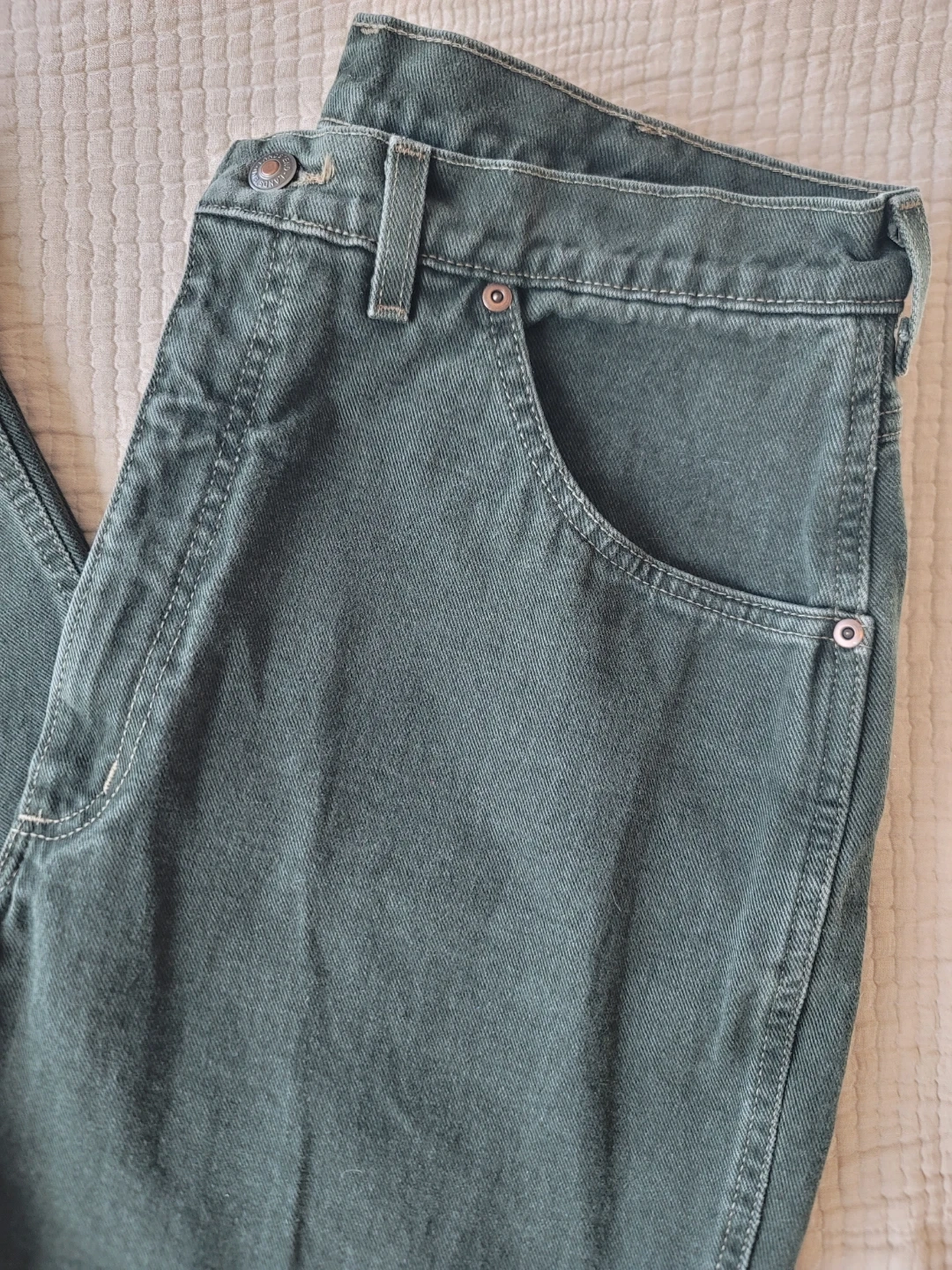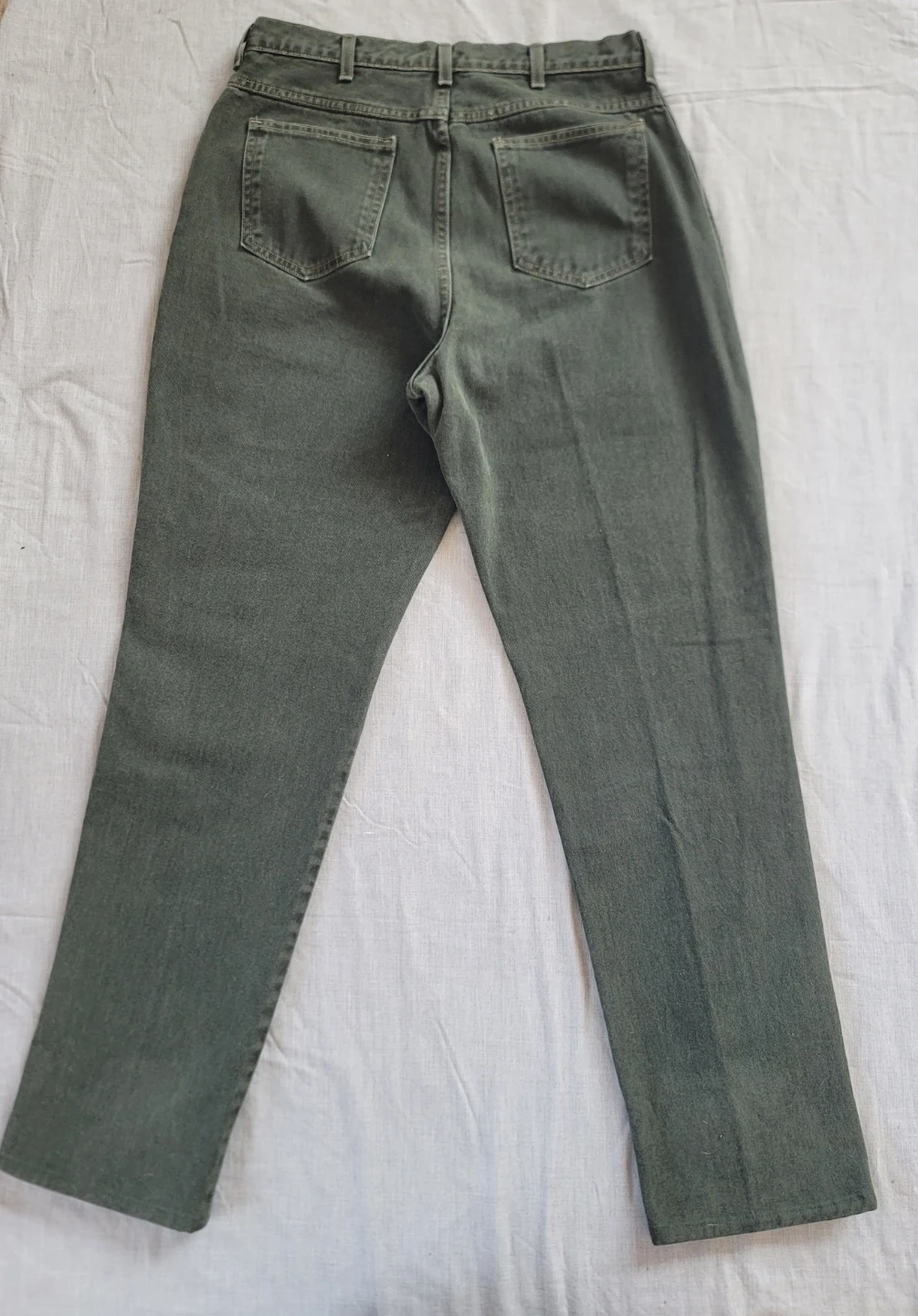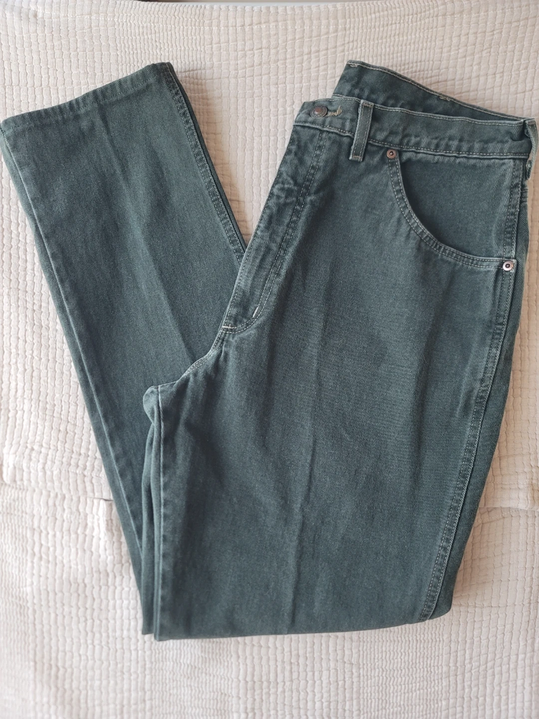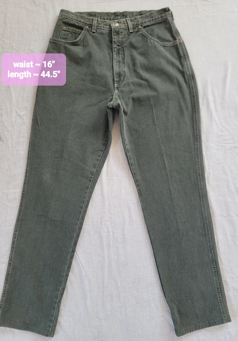Selling a pair of green jeans. The waist is approximately 16 inches and the length is about 44.5 inches. They are in good condition and ready for a new owner!