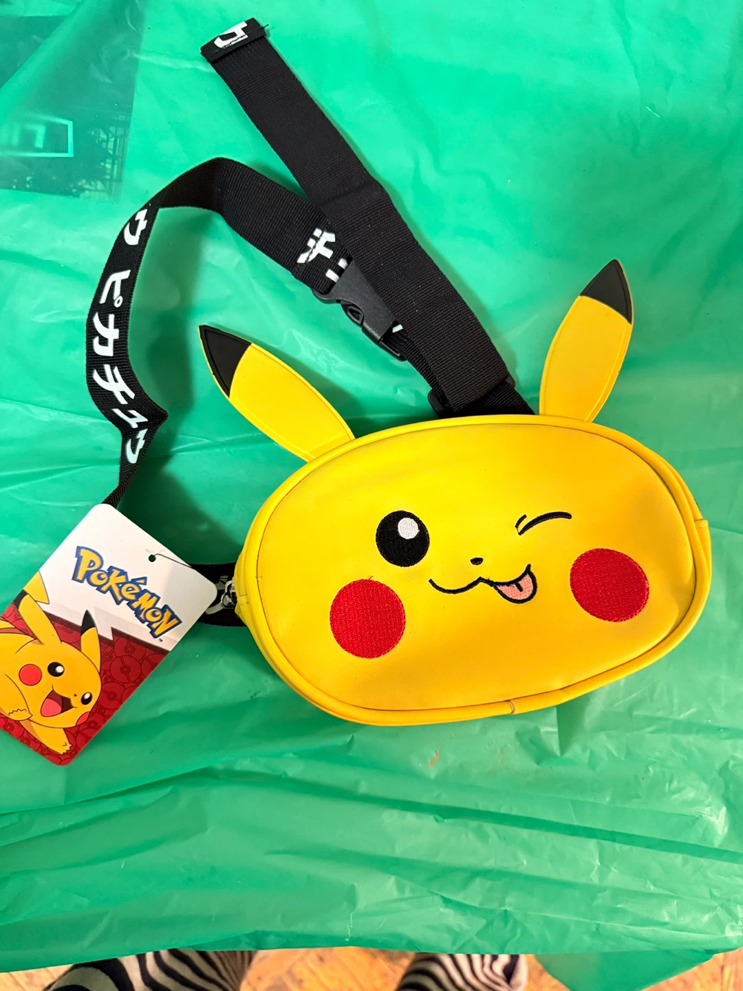 This is a fun yellow fanny pack featuring Pikachu's face! It's a great accessory for Pokemon fans. The adjustable strap makes it easy to wear around your waist.