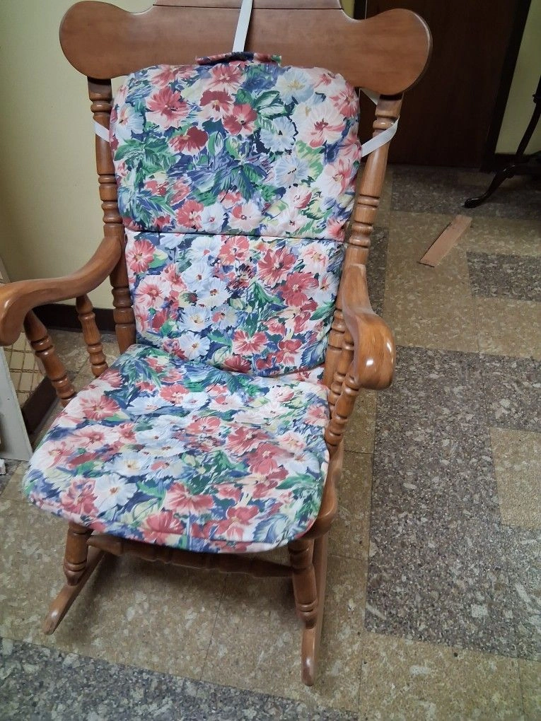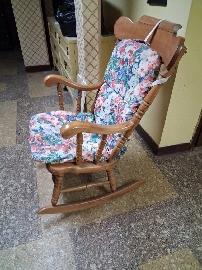 This is a sturdy rocking chair made from solid wood. It's a classic piece that would fit well in many homes. Feel free to message if you have any questions!