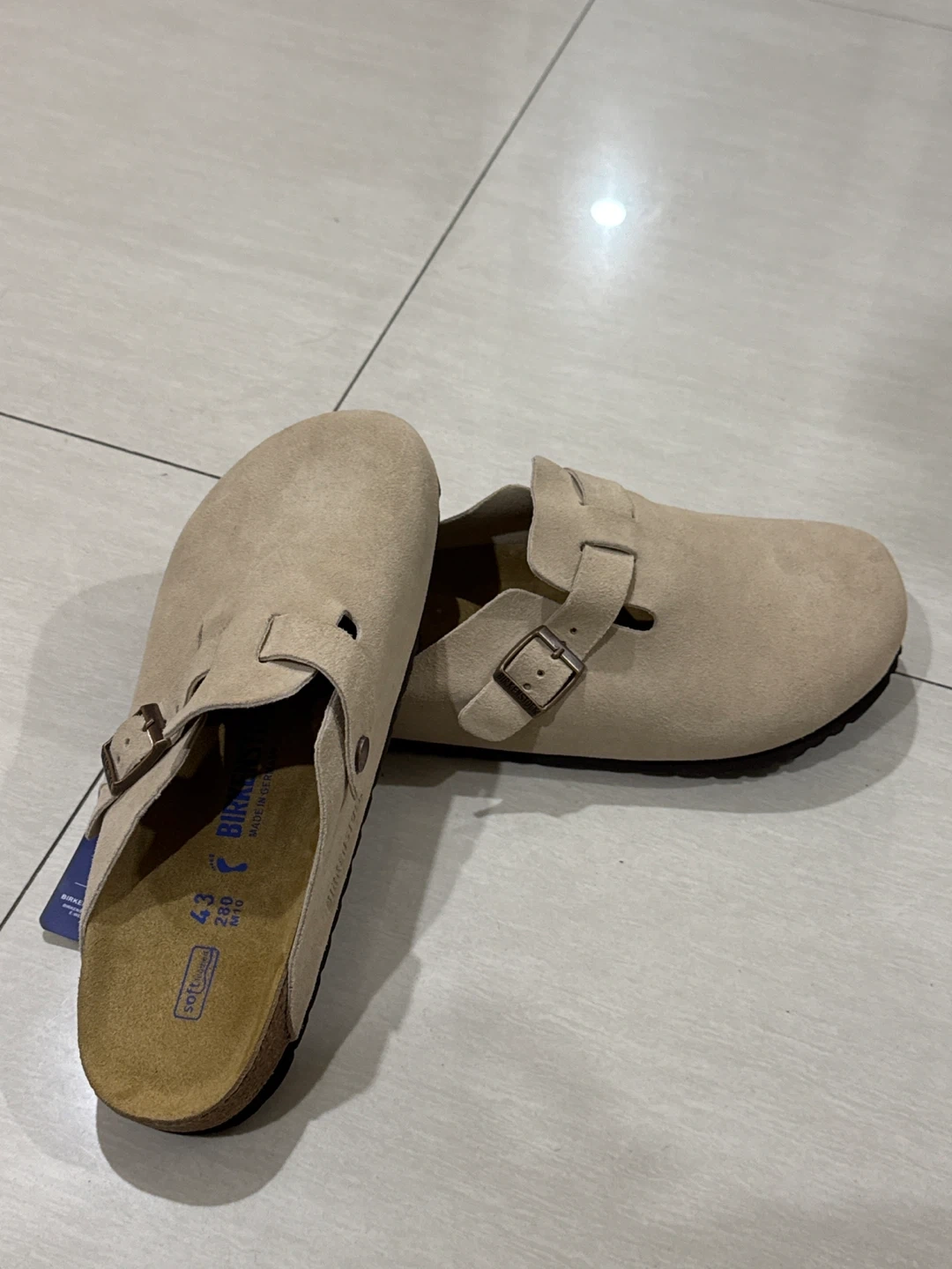 Birkenstock clogs in a beige suede material. Size 43, which is 280mm. They feature adjustable buckle straps. Comfortable footbed for all-day wear.