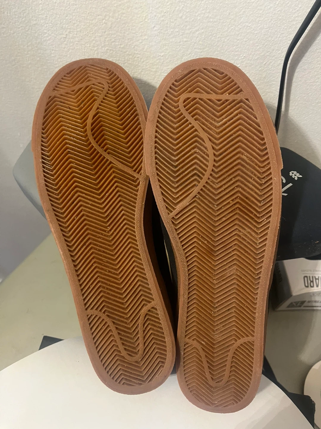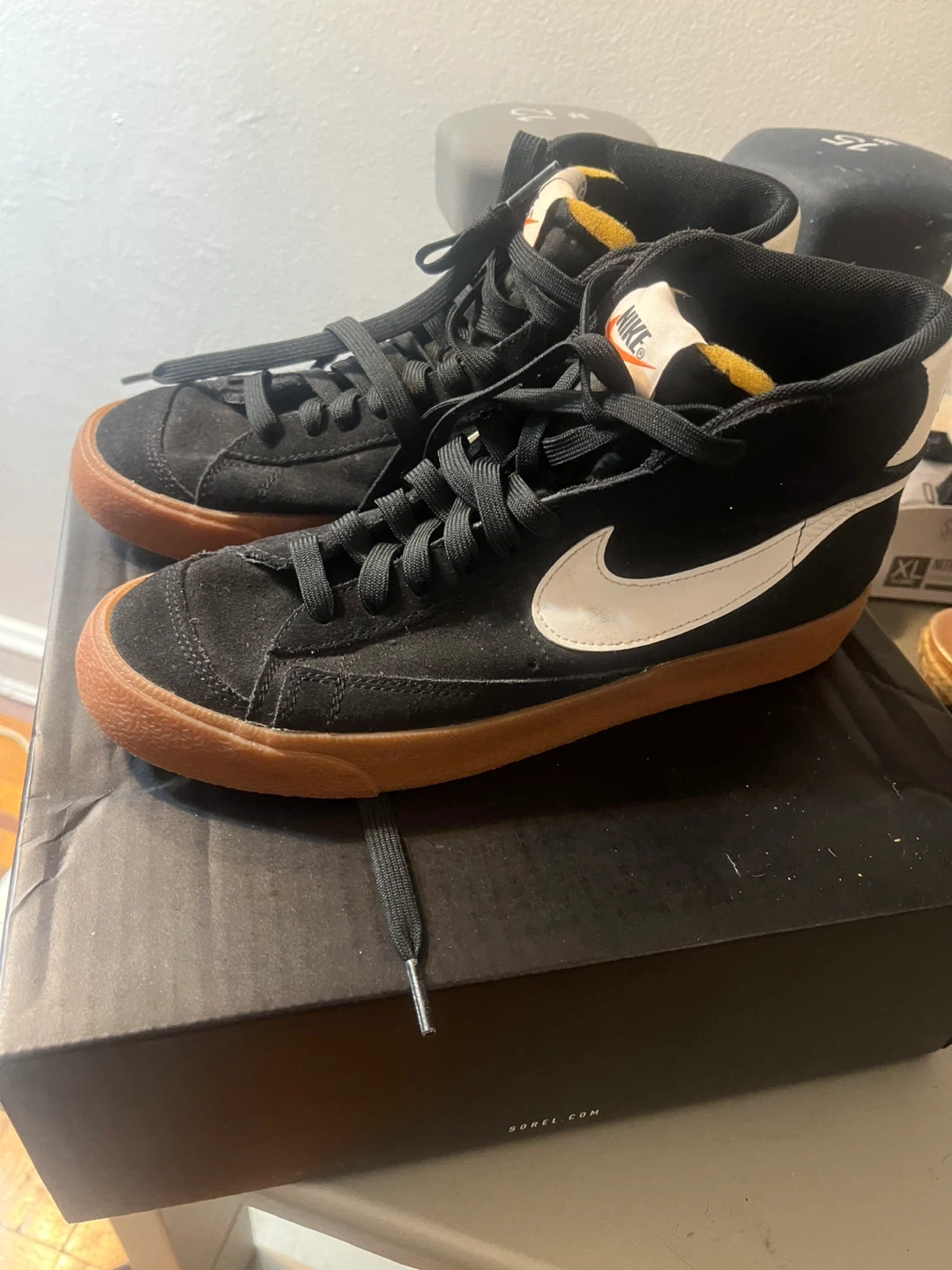 Black suede Nike Blazer Mid '77 Vintage sneakers with a white Swoosh and gum sole. These iconic high-top sneakers are perfect for everyday wear. The shoe's construction is primarily suede with a rubber outsole. 7 1/2