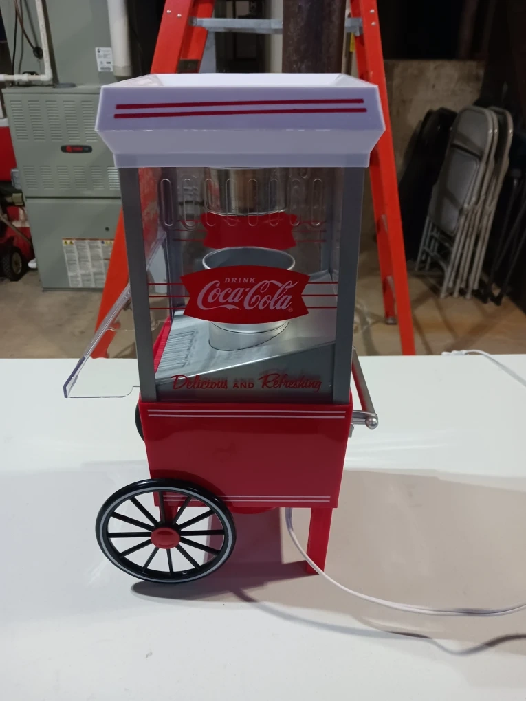 Enjoy that refreshing feeling with this Coca-Cola popcorn machine! It's perfect for movie nights or adding a touch of vintage charm to your kitchen. Get ready to enjoy some delicious and refreshing popcorn! New never used