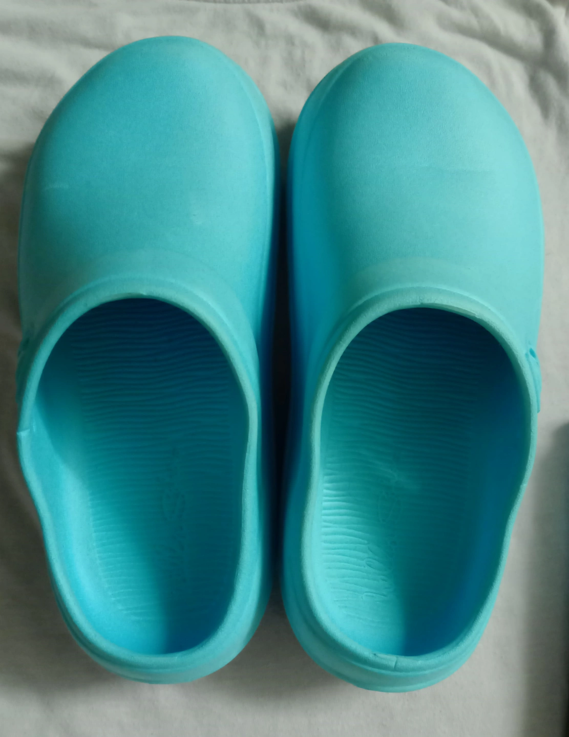 Pair of light blue plastic clogs. Slip-on style. Comfortable and easy to clean. Lightweight and great for casual wear.