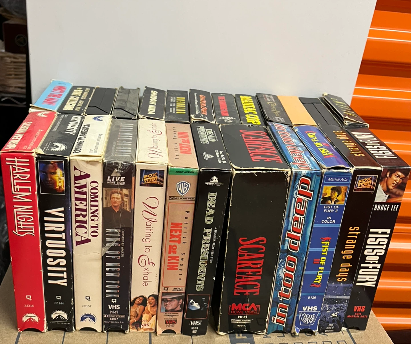 8 for $25 - Selling a collection of 16 VHS movies. Titles include Harlem Nights, Virtuosity, Coming to America, King of New York, Waiting to Exhale, Next of Kin, Dead Presidents, Scarface, In Too Deep, Fist of Fury, Fist of Fury II, and Strange Days. Some titles feature martial arts and action. They are in their original sleeves.