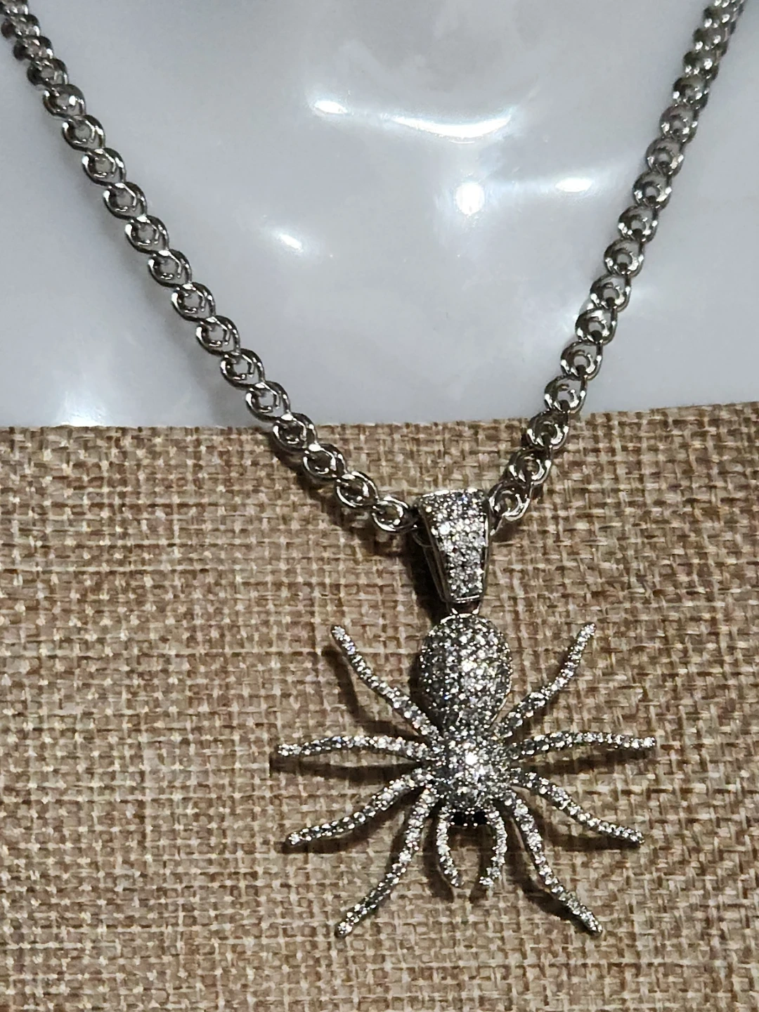 4 layers of 14k white Gold plated, Sparkling spider pendant necklace with pave crystal detailing. Silver-tone chain included. This necklace adds a unique statement to any outfit!
