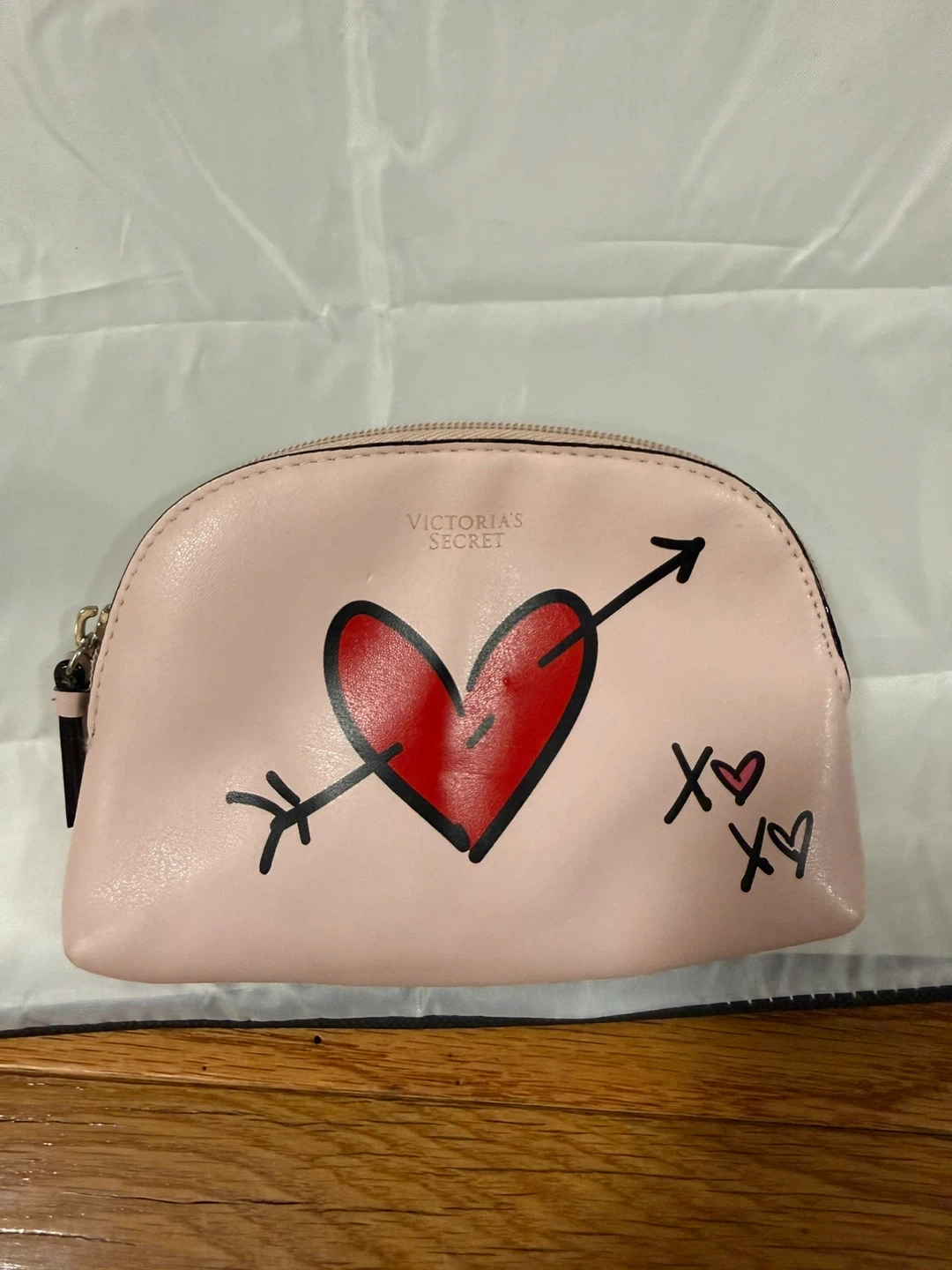 This is a Victoria's Secret makeup bag. It's pink with a red heart pierced by an arrow and "xo" accents. Its material appears to be faux leather.