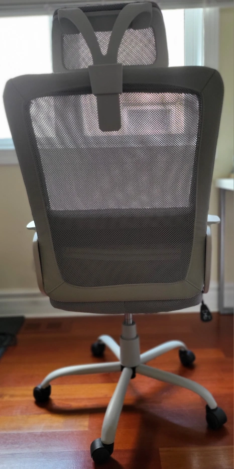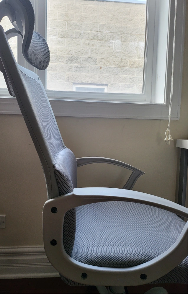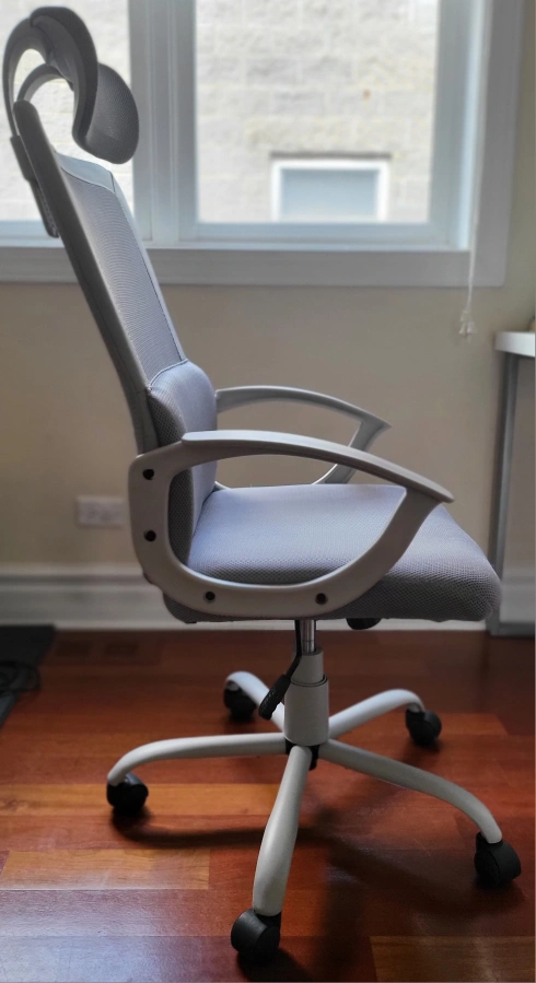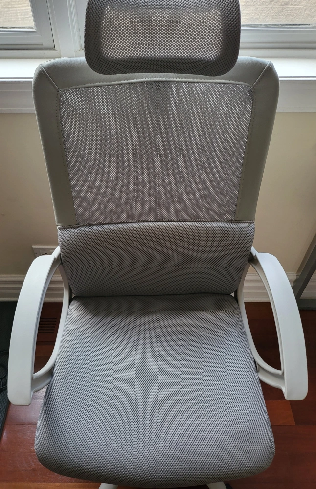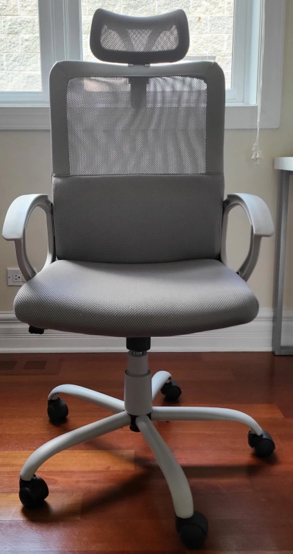 Selling a comfortable gray ergonomic office chair! It features a supportive headrest and breathable mesh back, perfect for long hours at your desk. The chair is in great condition and ready for a new home