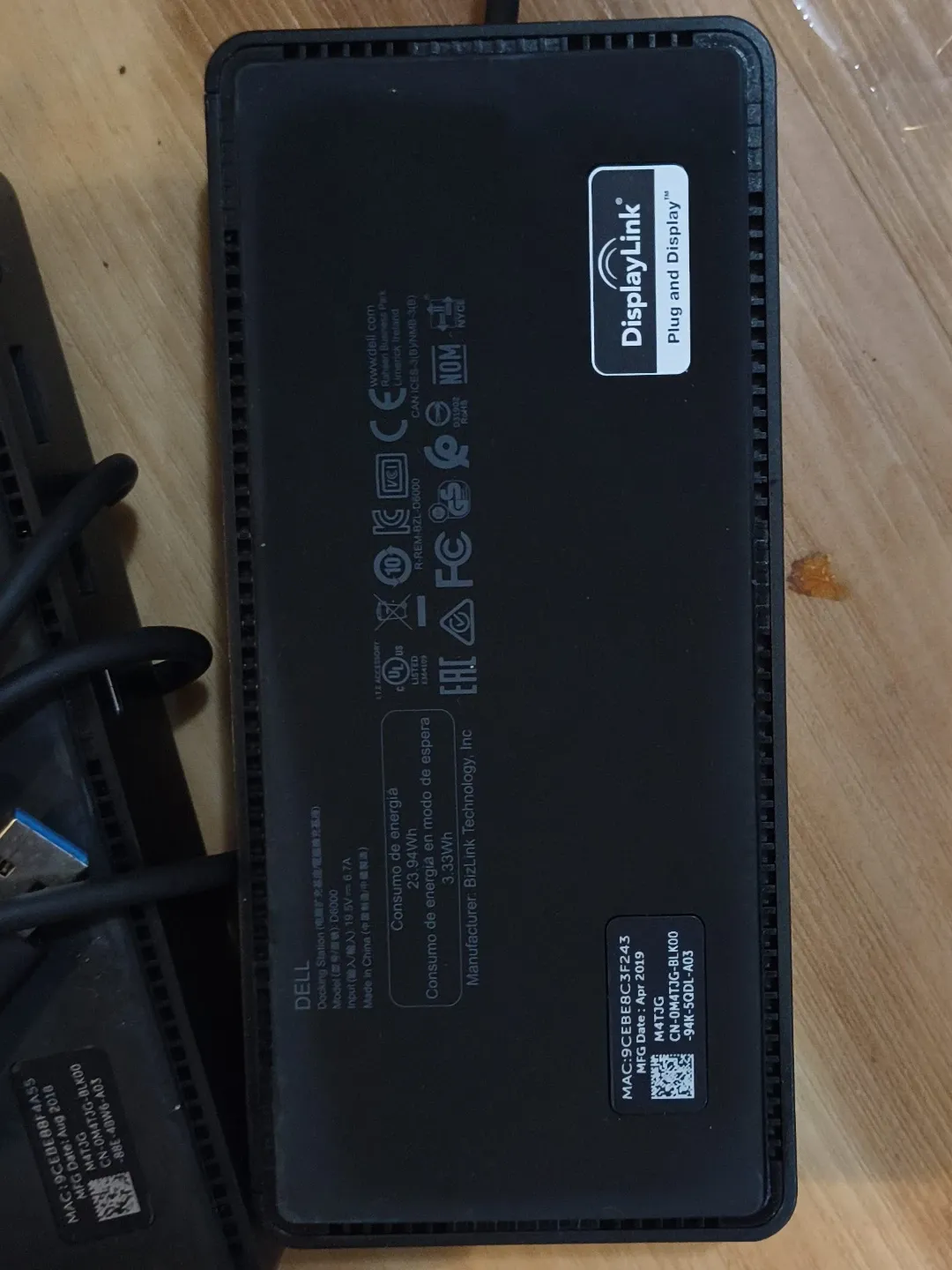 Dell D6000 Universal Docking Station. Input: 19.5V 6.7A. Manufacturing Date: April 2019. Manufacturer: BizLink Technology, Inc. Includes DisplayLink Plug and Display technology.