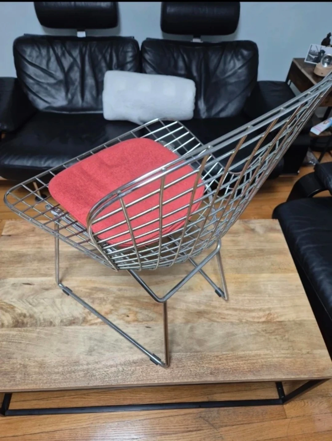 Selling a Harry Bertoia-style wire chairs! It features a sleek chrome finish and a vibrant red cushion. This chair is a stylish addition to any room. The wire design is both modern and comfortable. Perfect for adding a touch of mid-century flair to your home. Measures approximately 25" W x 28" D x 29" H.