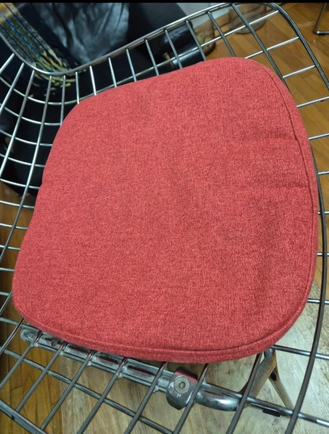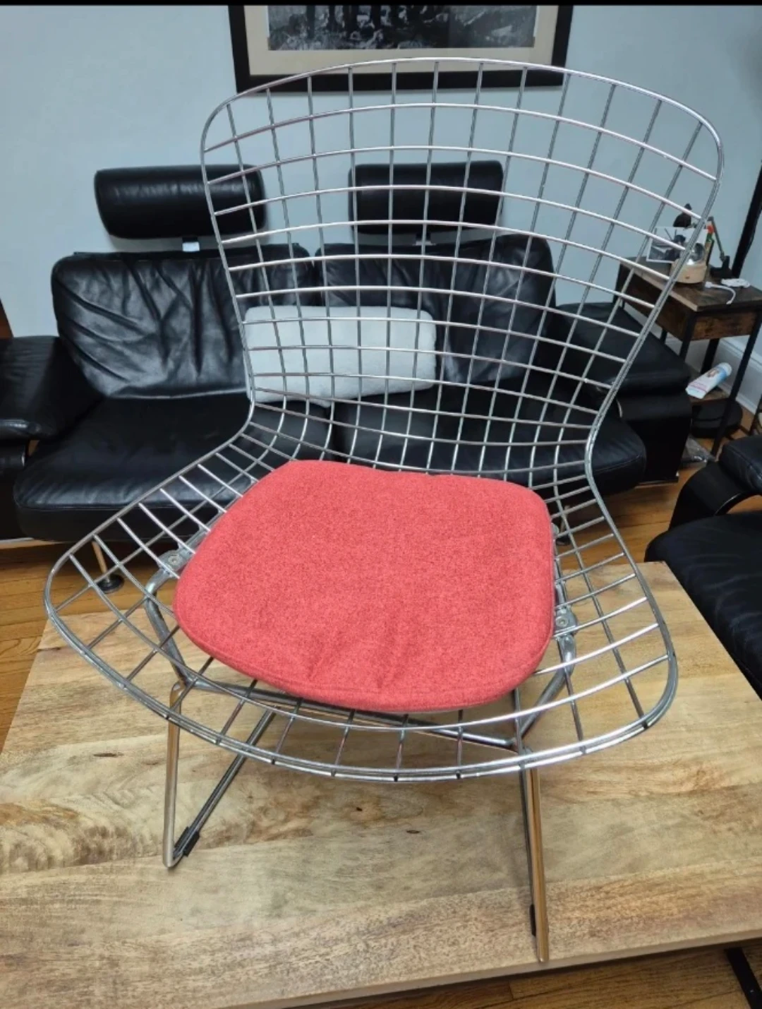 Selling a Harry Bertoia-style wire chairs! It features a sleek chrome finish and a vibrant red cushion. This chair is a stylish addition to any room. The wire design is both modern and comfortable. Perfect for adding a touch of mid-century flair to your home. Measures approximately 25" W x 28" D x 29" H.