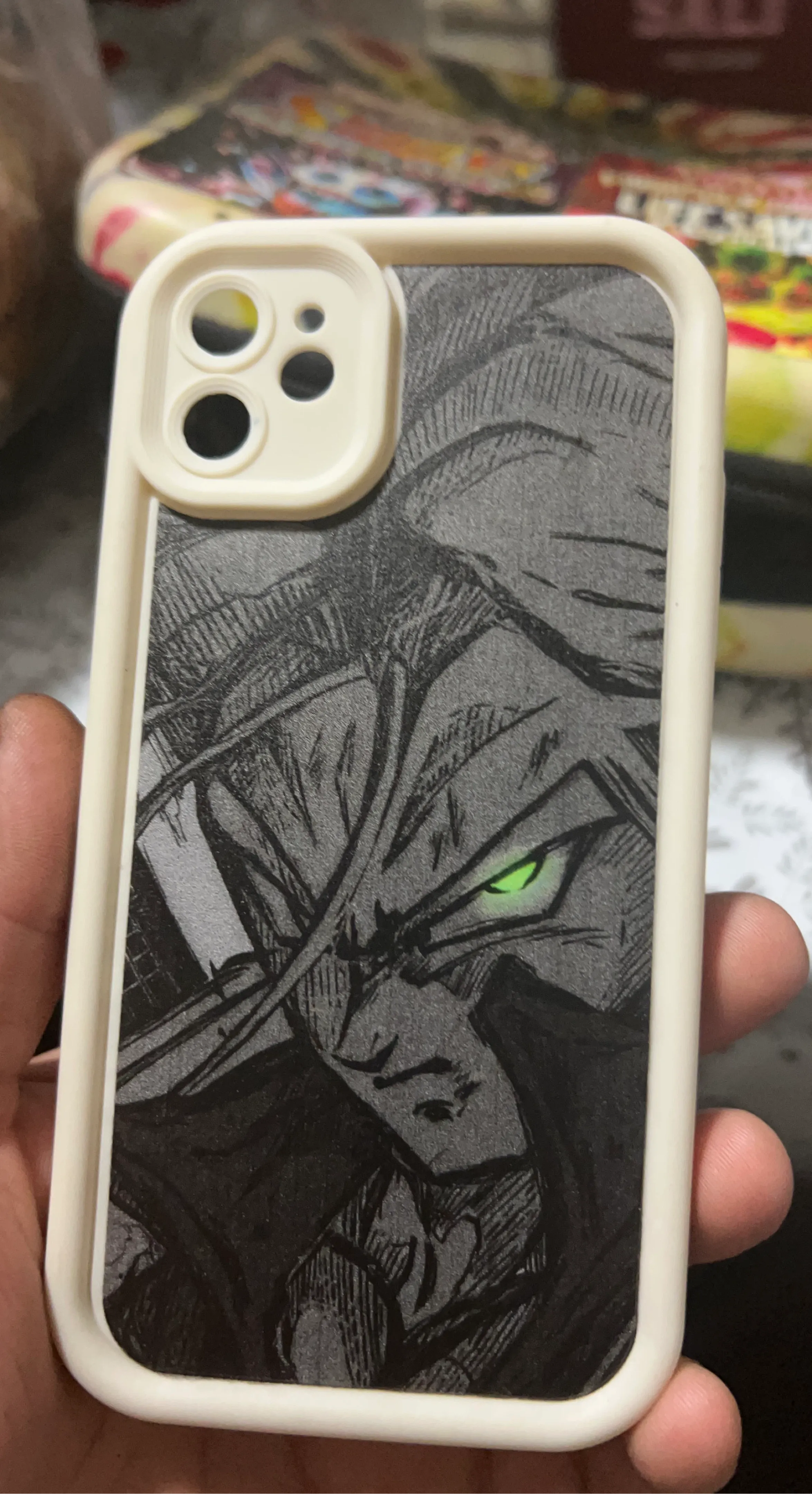 This phone case features a striking black and white illustration of Broly from Dragon Ball Z, with his iconic glowing green eye. It's made of durable material and offers protection for your phone. The case is designed for a specific phone model, ensuring a snug fit.