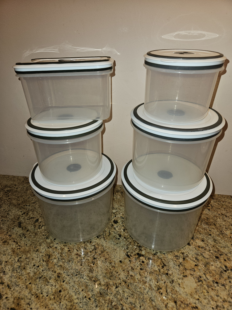 Selling a set of six clear plastic food storage containers. They come in various sizes and are perfect for keeping your pantry organized or storing leftovers. The lids have a white and black seal to help keep food fresh. They are in great condition and ready for a new home!