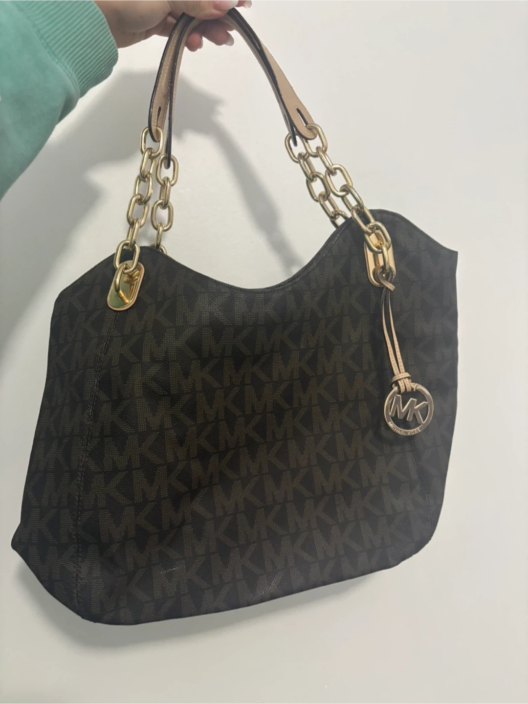 A stylish Michael Kors hobo handbag featuring the signature MK print. It has gold-tone hardware and chain details on the straps. Perfect for everyday use!