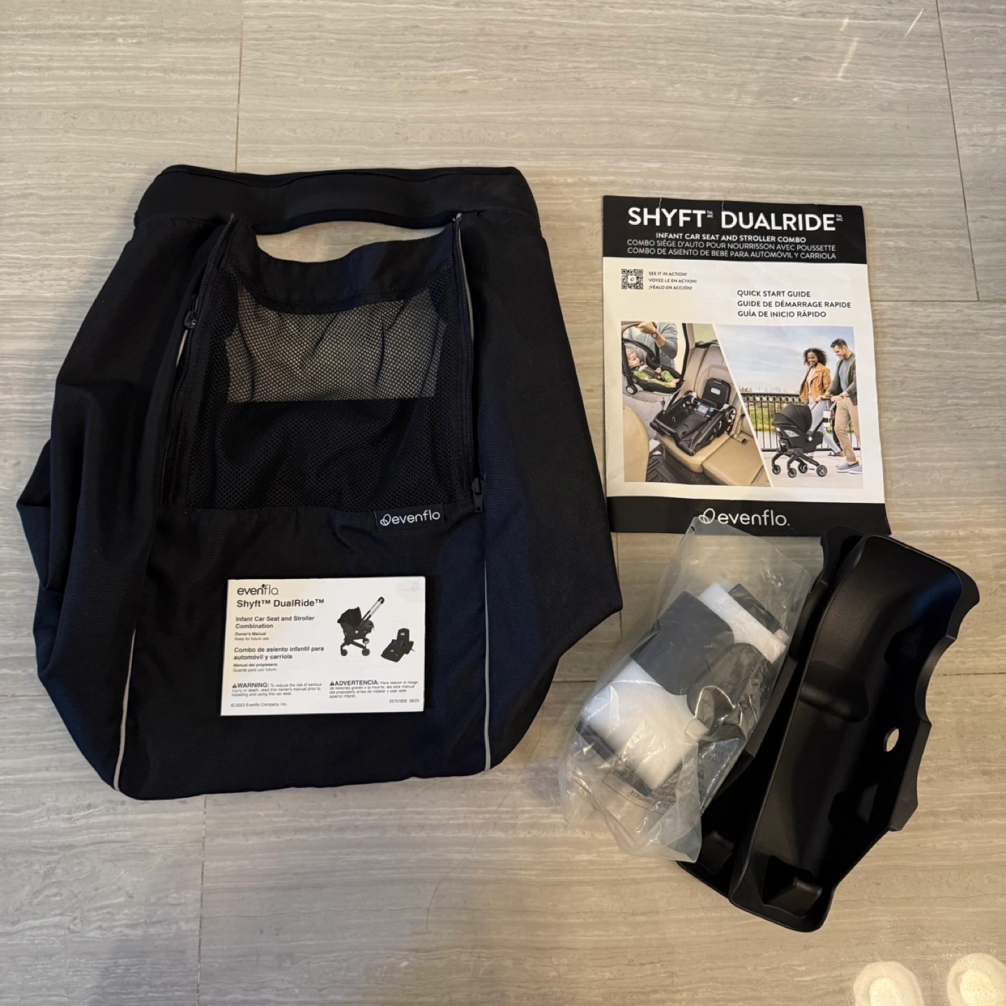 Selling an Evenflo Shyft DualRide infant car seat and stroller combo. It includes the infant car seat, stroller frame, car seat base, parent cup holder, and quick start guide. This combo is designed for both car rides and strolls, making it super convenient!