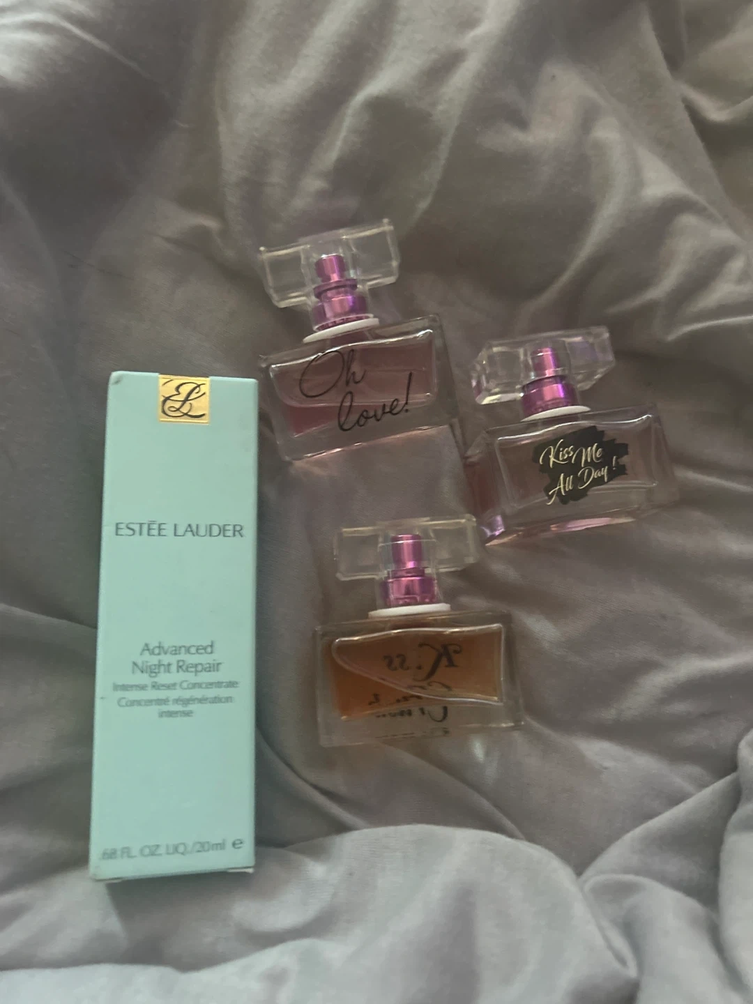 Selling a bundle of Estee Lauder Advanced Night Repair Intense Reset Concentrate (0.68 fl oz/20ml) along with three mini perfumes. The perfumes are labeled 'Oh Love!', 'Kiss Me All Day!', and '22'.
