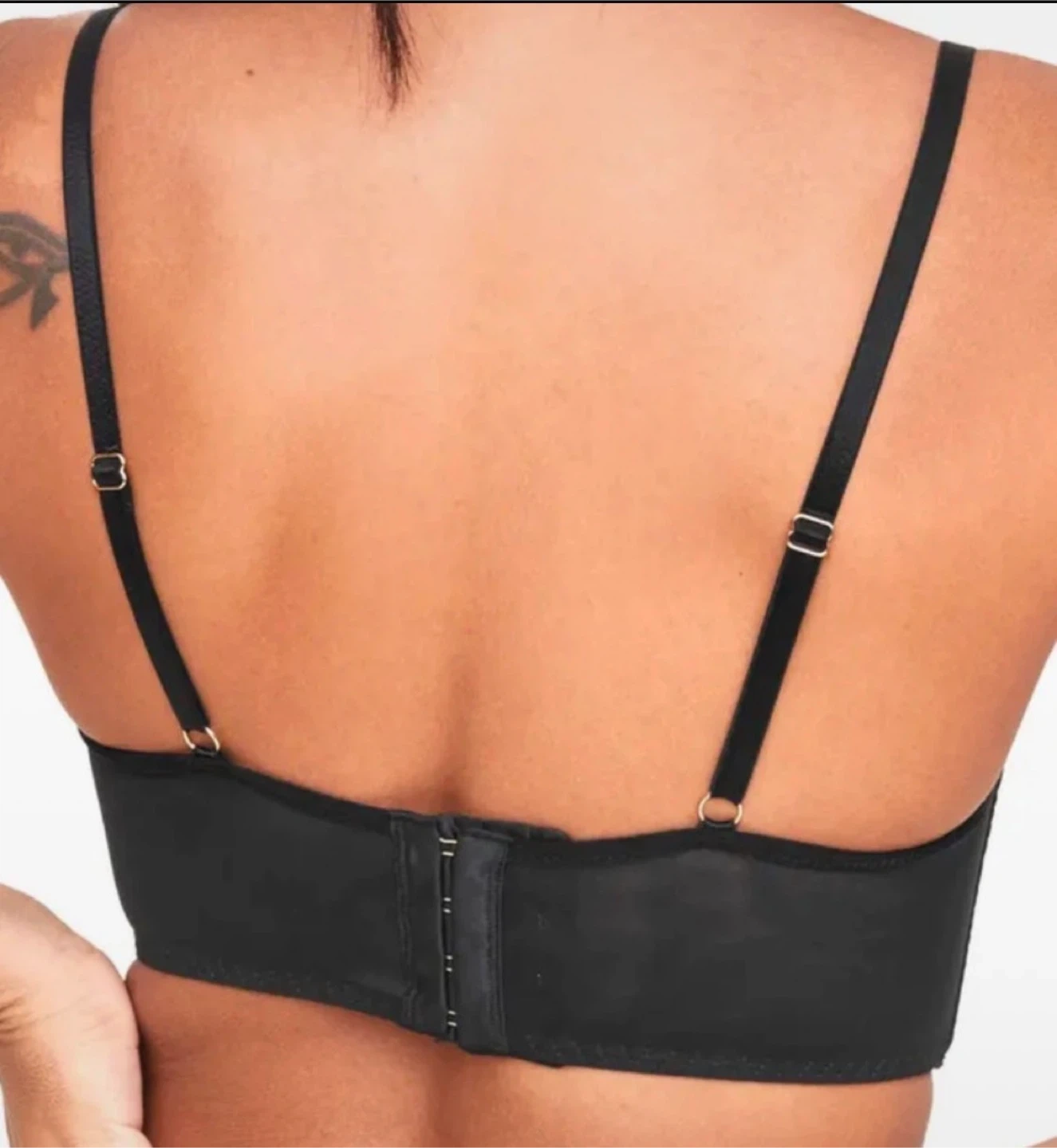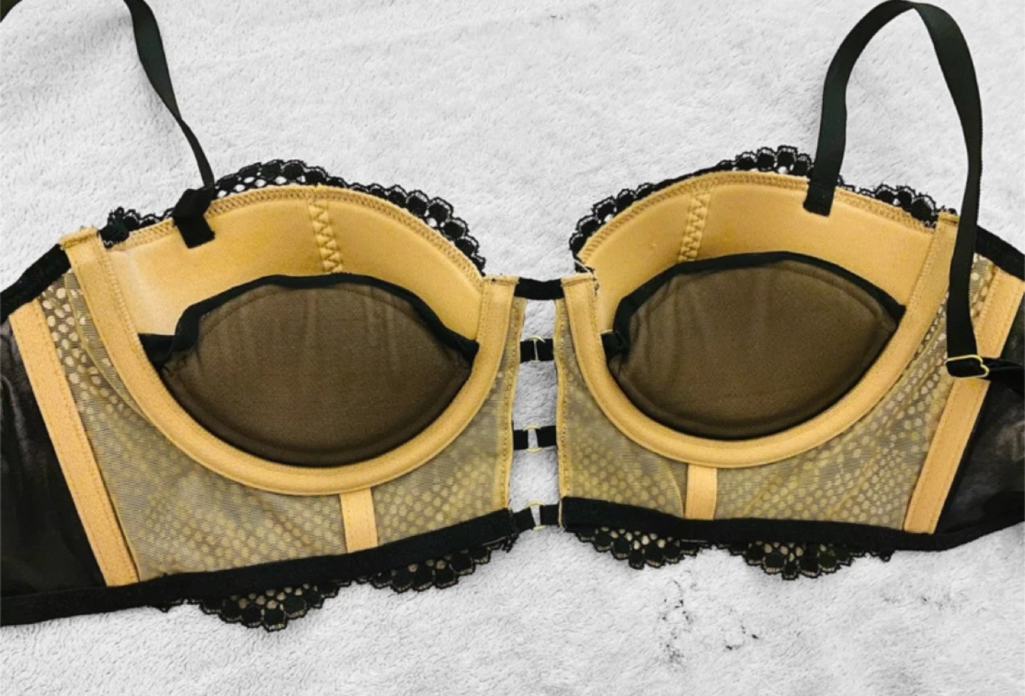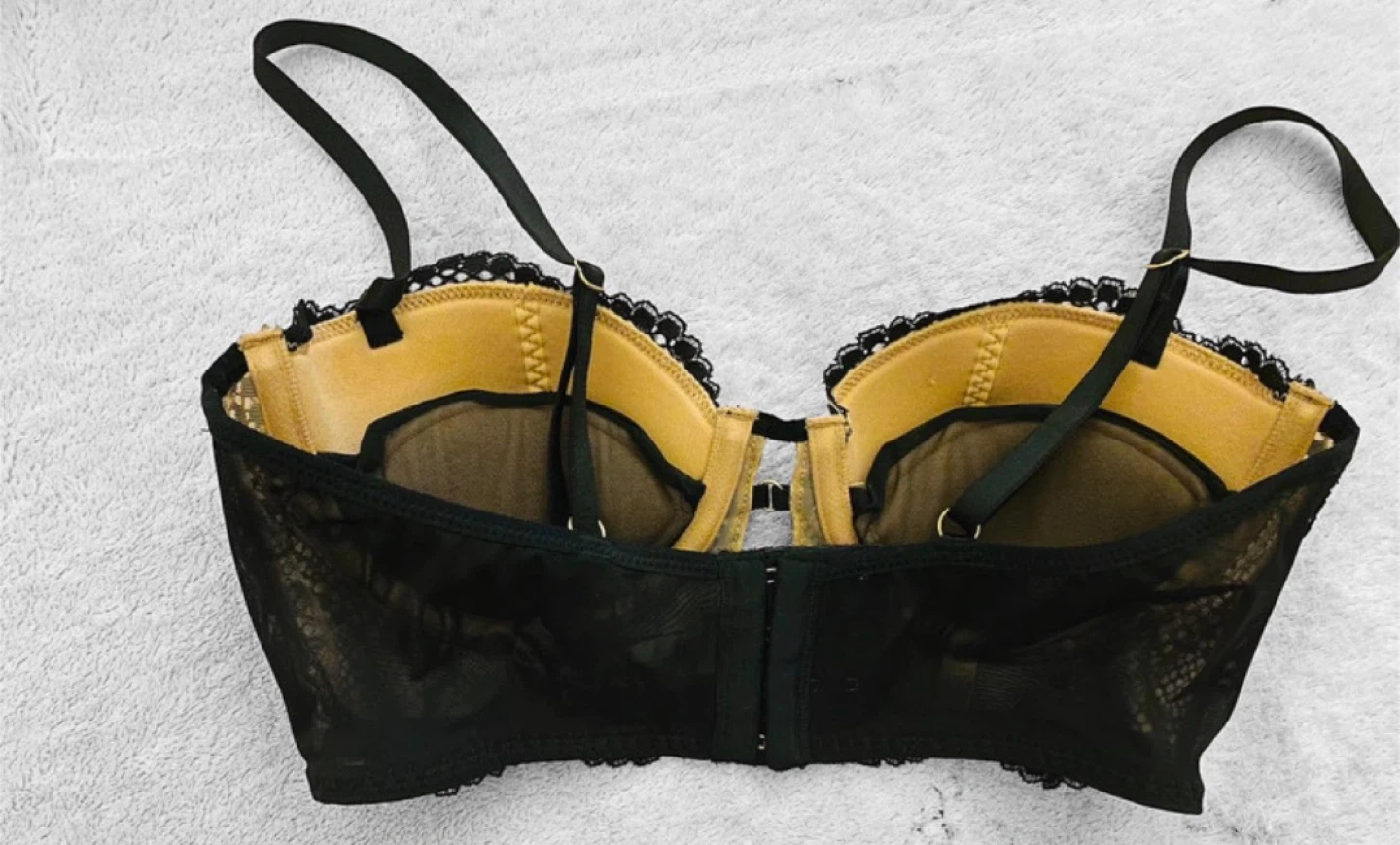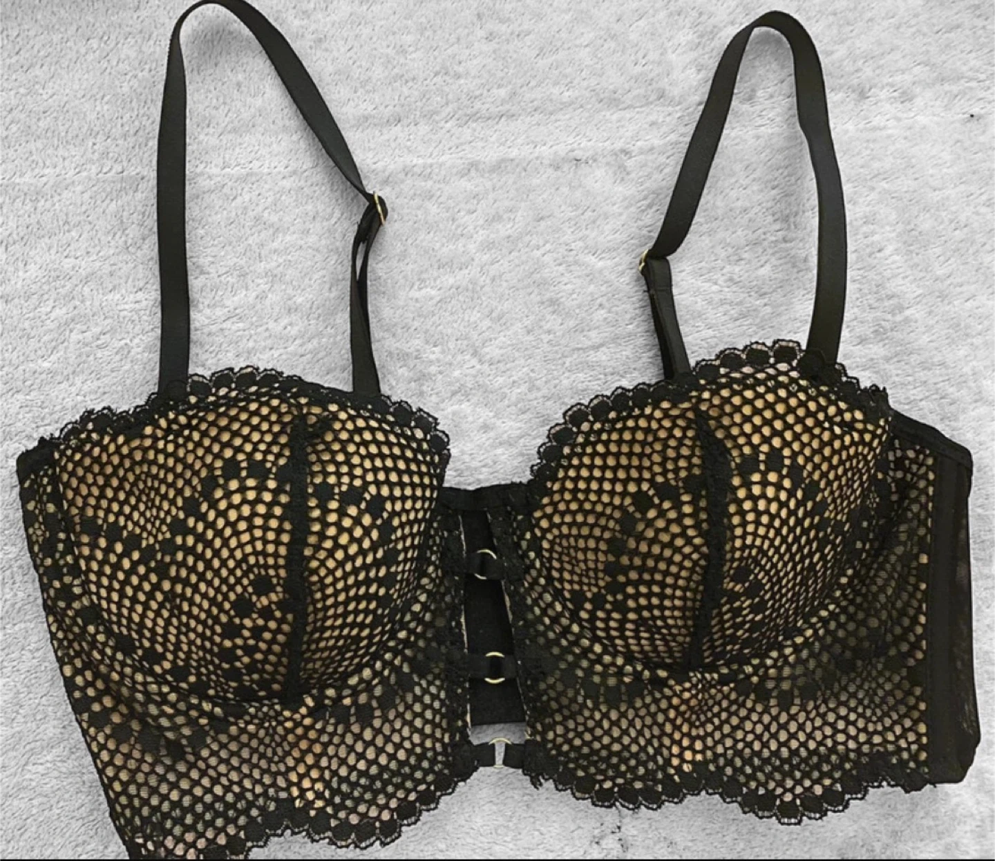 Black balconette bra with intricate lace detailing and gold hardware accents. Features adjustable straps and a hook-and-eye closure. Lace overlay on cups and trim. Underwire support.