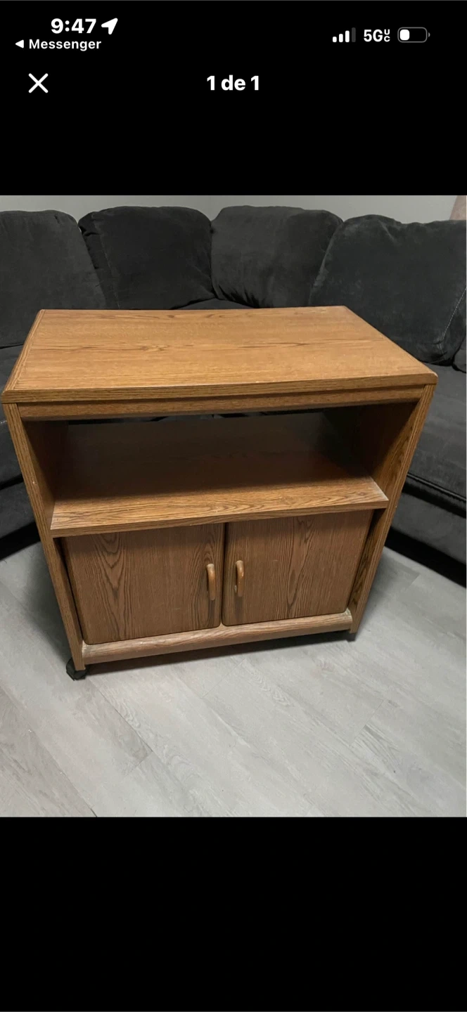 This wooden media console features two cabinet doors for storage and an open shelf. It's made of wood with a light oak finish. Perfect for organizing electronics or as a TV stand.