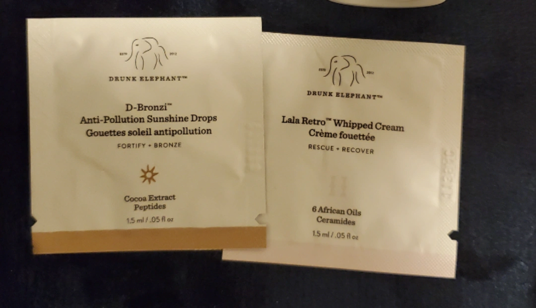 Two sample packets of Drunk Elephant skincare products. D-Bronzi Anti-Pollution Sunshine Drops and Lala Retro Whipped Cream. Each packet contains 1.5ml/.05 fl oz.