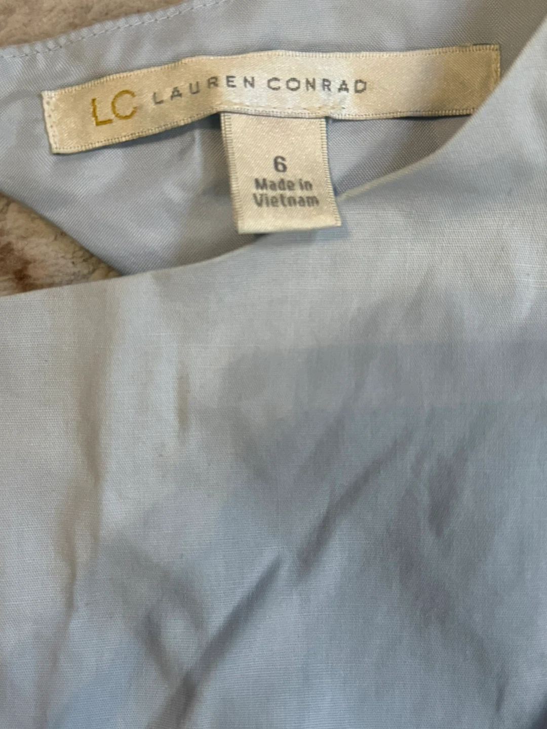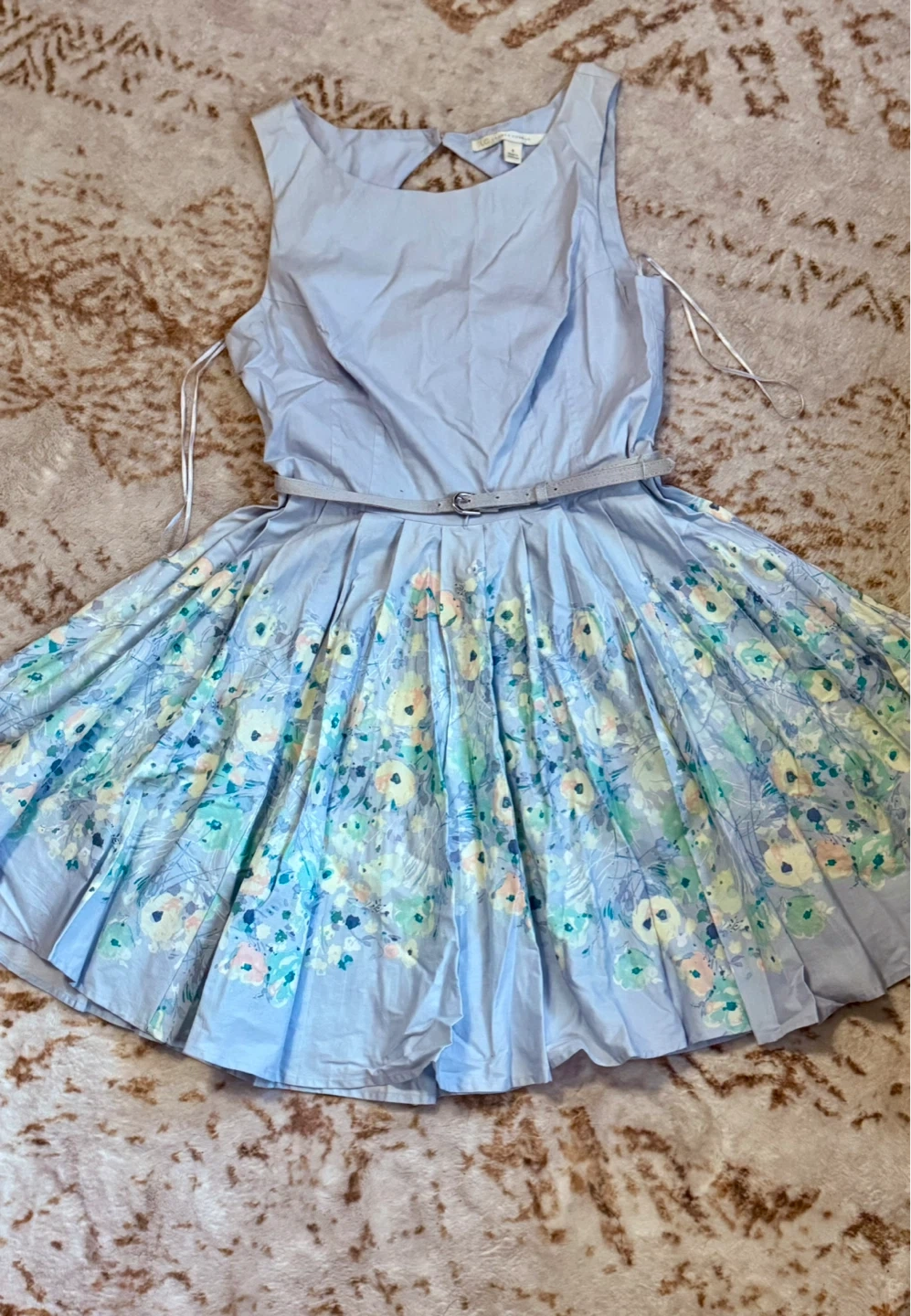 Lauren Conrad mini dress with a light blue bodice and a pleated floral print skirt. Includes a matching belt. Size 6.