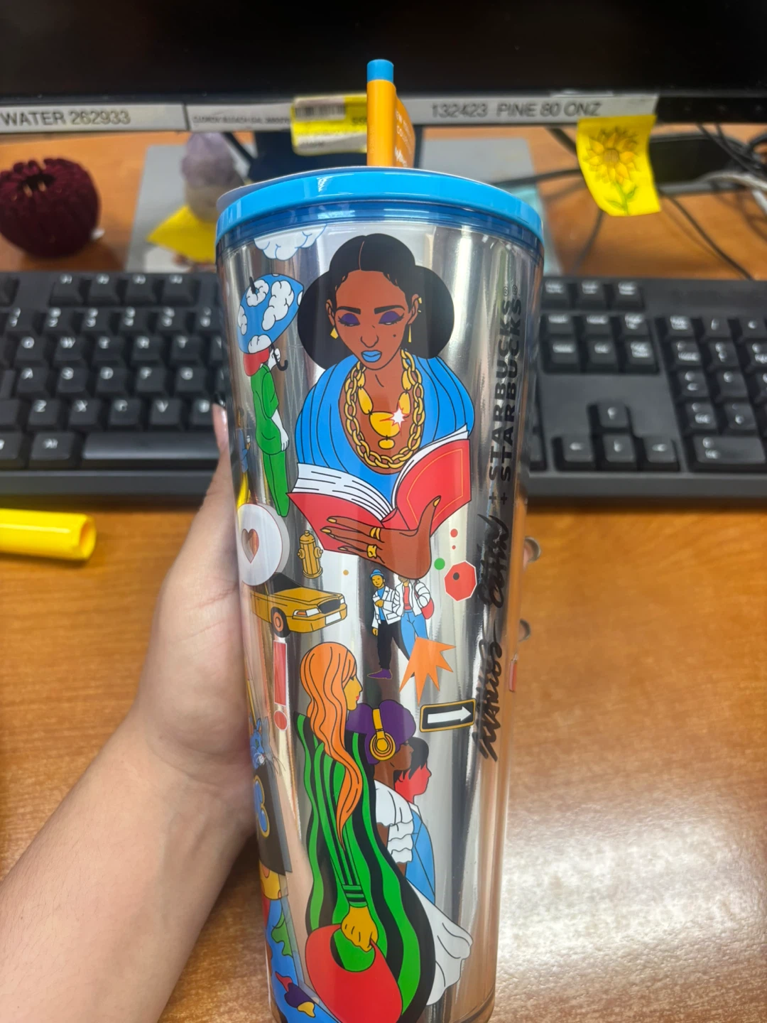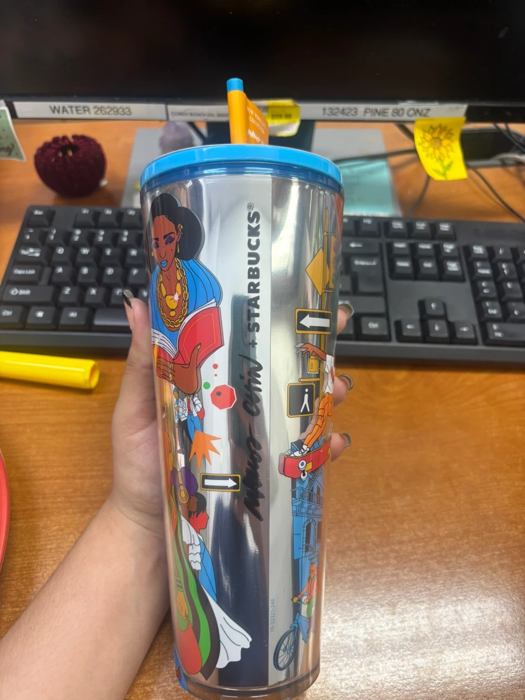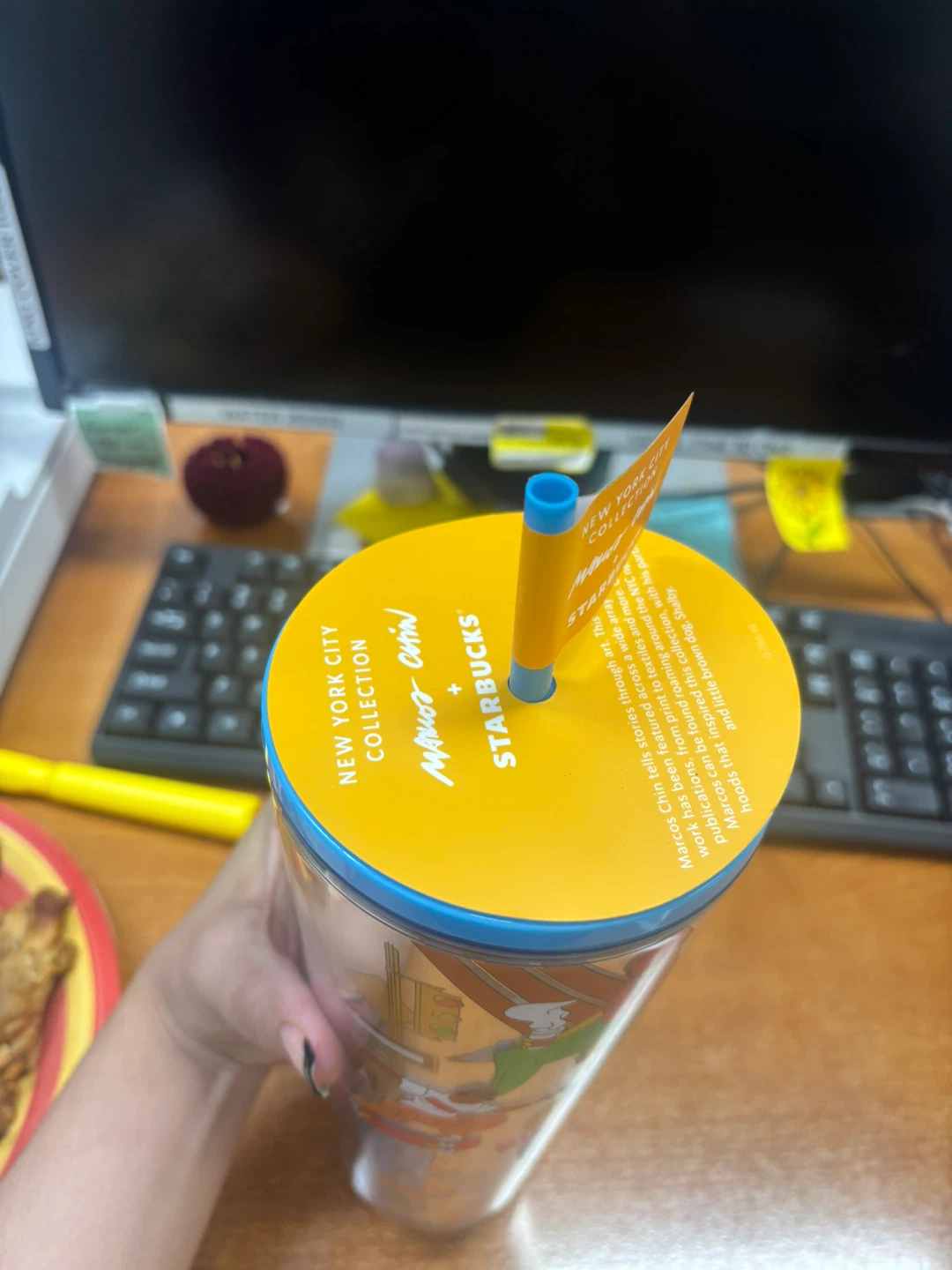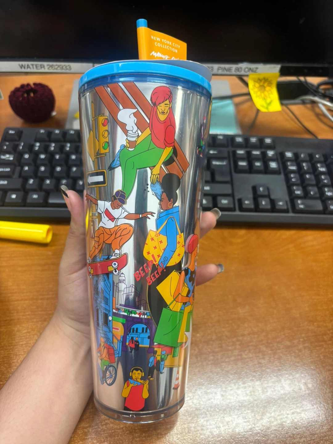 This Starbucks tumbler features the "New York City Collection" design by artist "Momo Chin". It's a reusable cup with a straw, perfect for on-the-go drinks. This cup showcases vibrant artwork depicting city life.