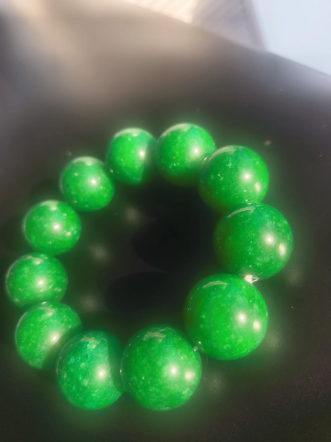 This is a green beaded bracelet. It's made of polished stone beads. The beads are a deep emerald green color.