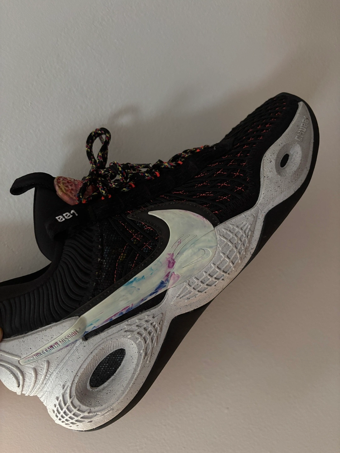 Men's Nike BB7 basketball shoes. Black and white colorway. Unique design details. Multicolored laces.